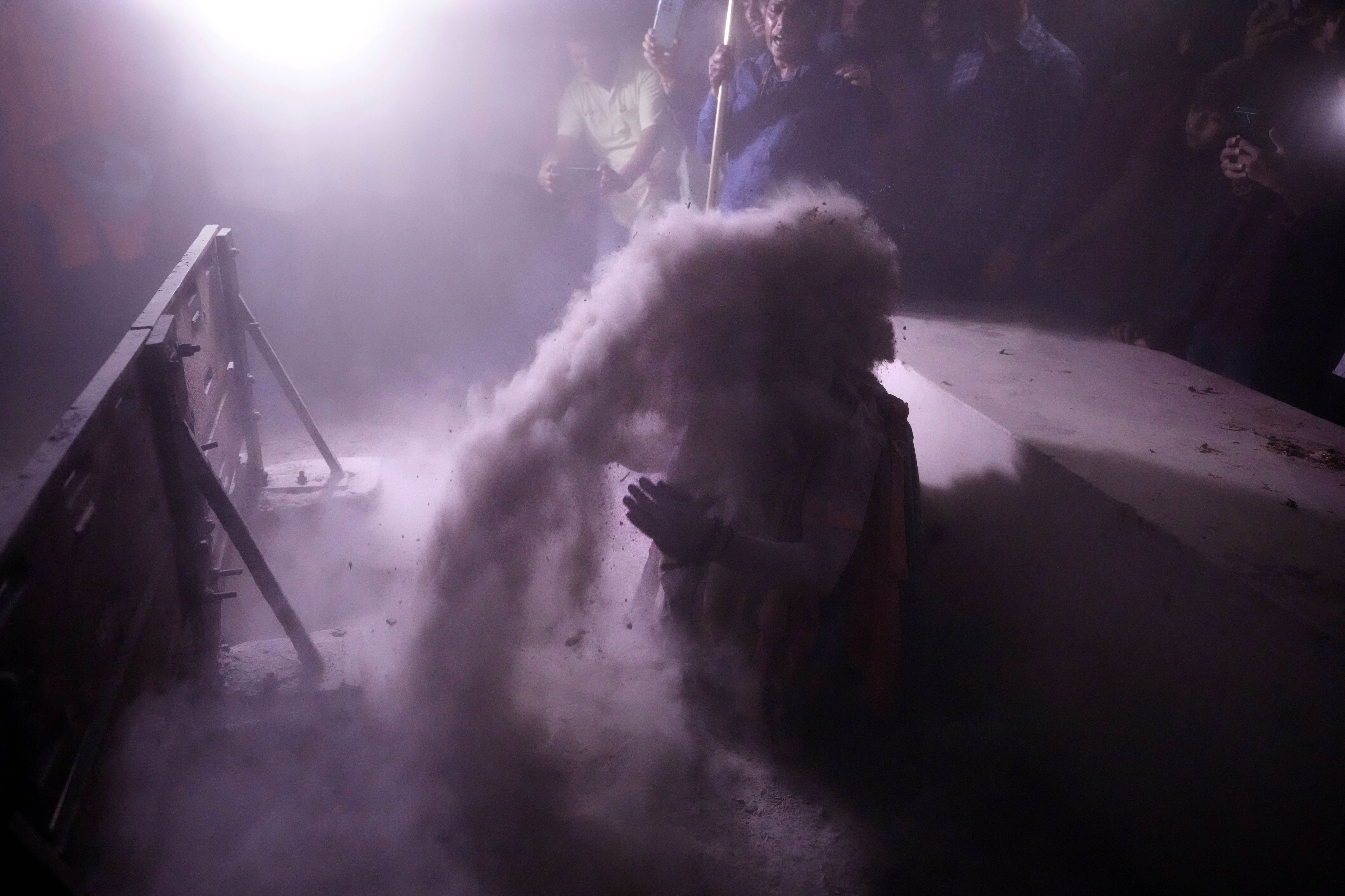 A Hindu holy man bathes with ash at crematorium in Jhulasan village of Mehsana district of Gujarat state on Shivratri festival, India, Wednesday, February 26, 2025. (Photo by Ajit Solanki/AP Photo)