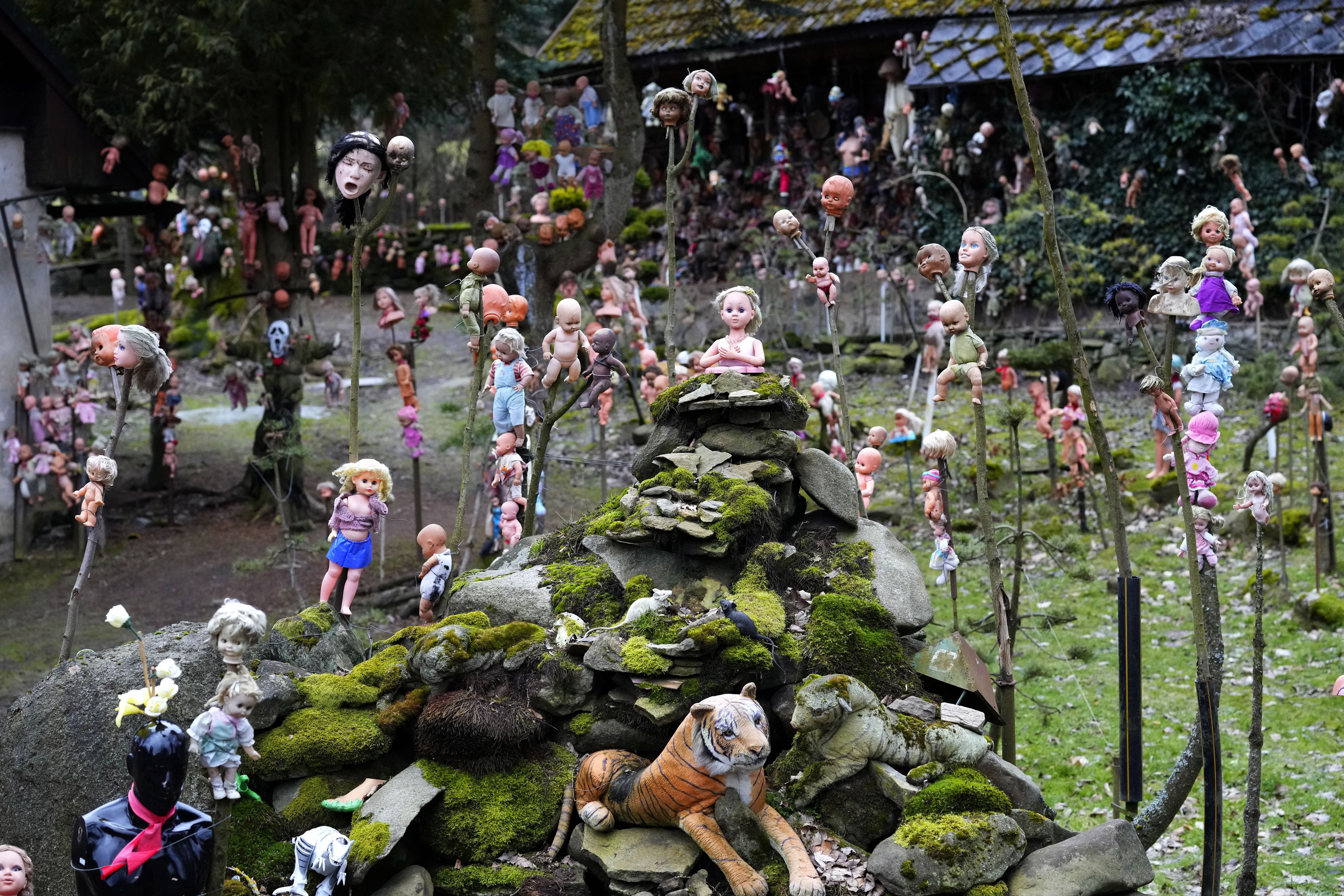 Dolls are displayed in a collector's backyard in the village of Rvacov, Czech Republic, Saturday, January 27, 2024. (Photo by Petr David Josek/AP Photo)