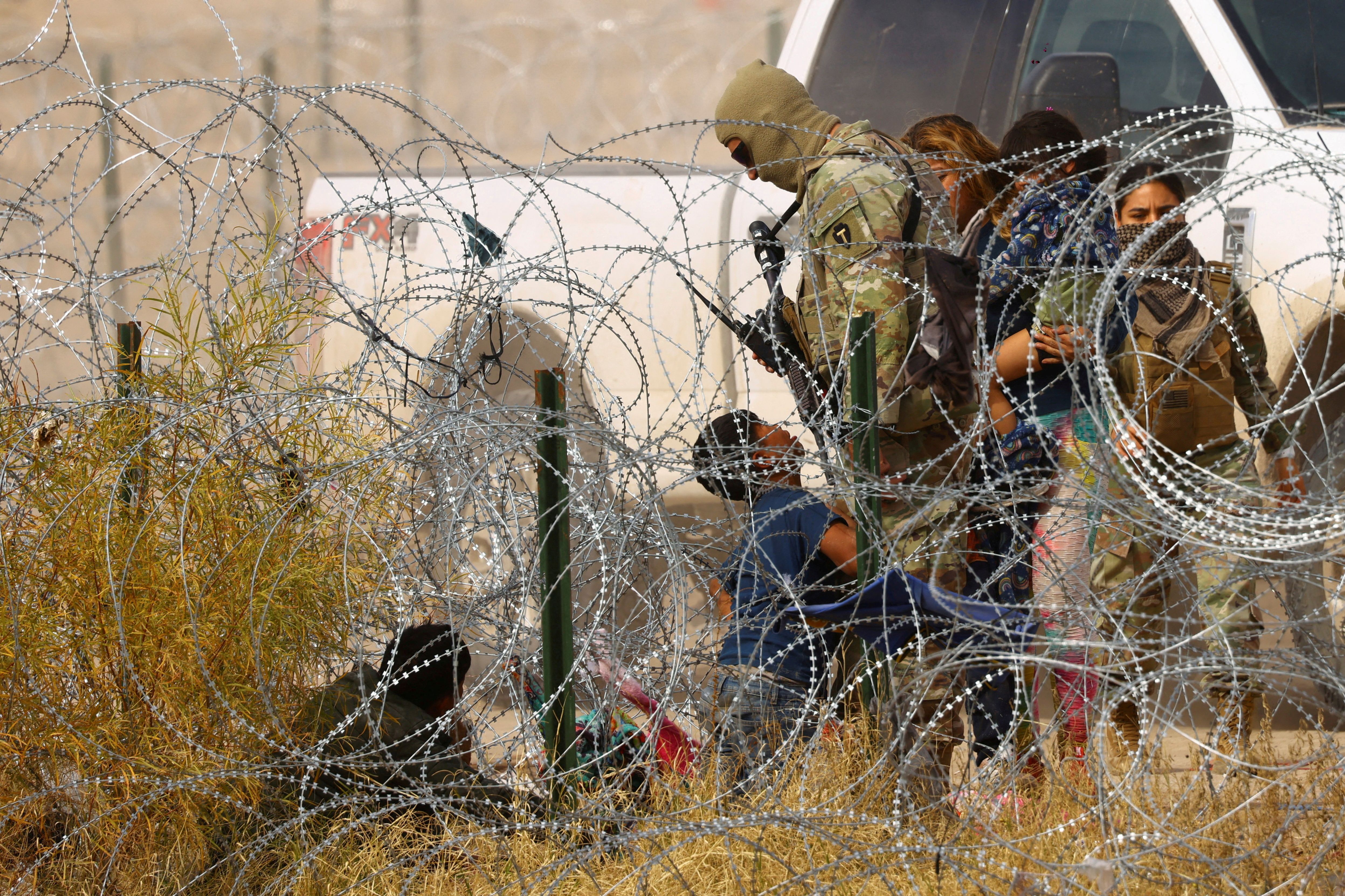 A migrant child seeking asylum kneels in front of a member of the Texas National Guard and asks to be allowed to enter the United States, after crossing razor wire deployed to prevent the crossing of migrants, as seen from Ciudad Juarez, Mexico, on January 30, 2024. (Photo by Jose Luis Gonzalez/Reuters)