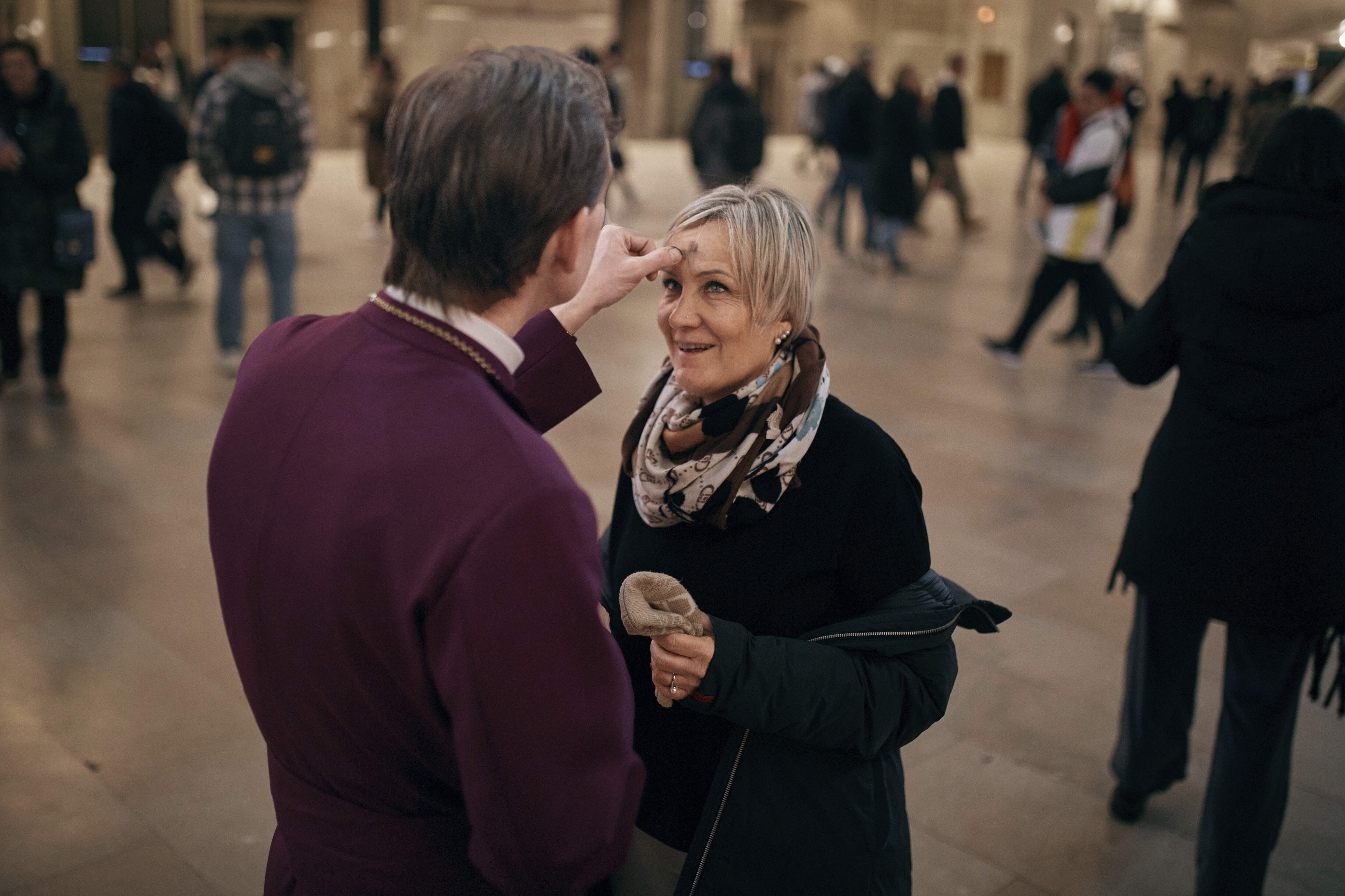 Rev. Matthew Heyd, the 17th Episcopal Bishop of New York, offers Ashes to Go at Grand Central Station on Wednesday, March 5, 2025 in New York. (Photo by Andres Kudacki/AP Photo)