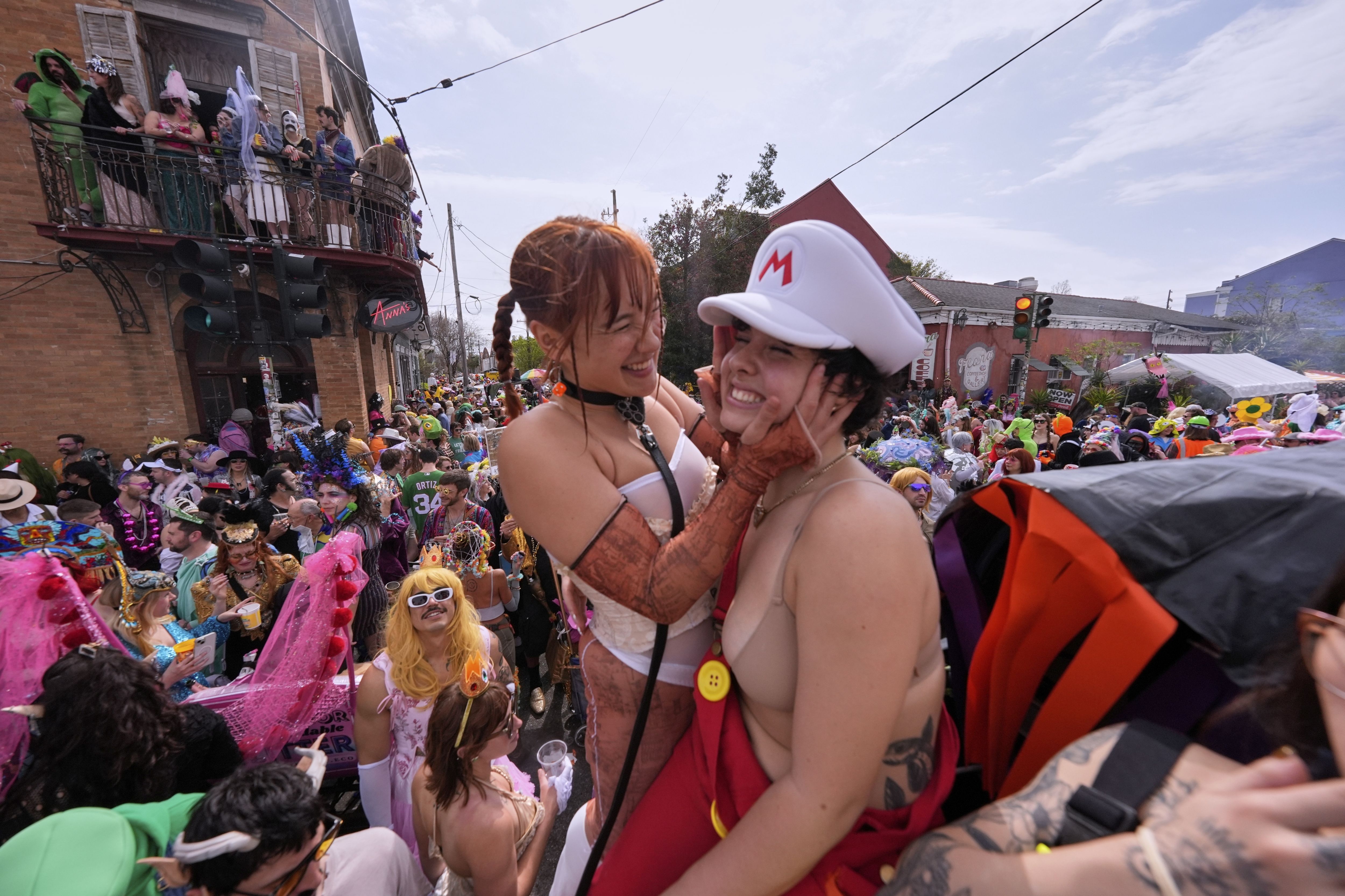 Elya and Viper have some fun during the start of the Society of Saint Anne's parade on Mardi Gras Day, Tuesday, March 4, 2025 in New Orleans. (Photo by Gerald Herbert/AP Photo)