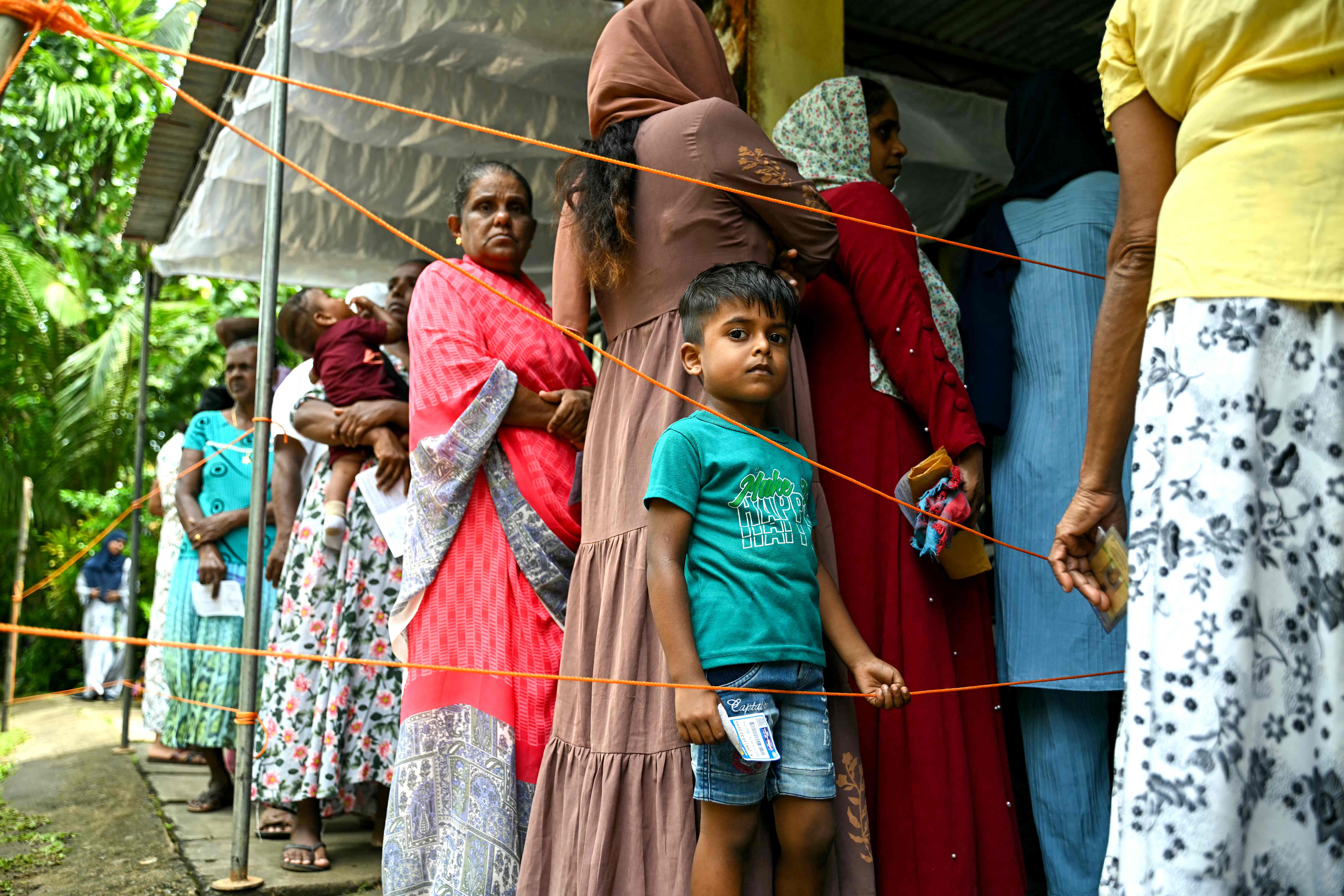 People wait in a queue to cast their ballots at a polling station during voting in Sri Lanka's presidential election in Galle on September 21, 2024. Cash-strapped Sri Lanka began voting for its next president September 21 in an effective referendum on an unpopular International Monetary Fund austerity plan enacted after the island nation's unprecedented financial crisis. (Photo by Idrees Mohammed/AFP Photo)