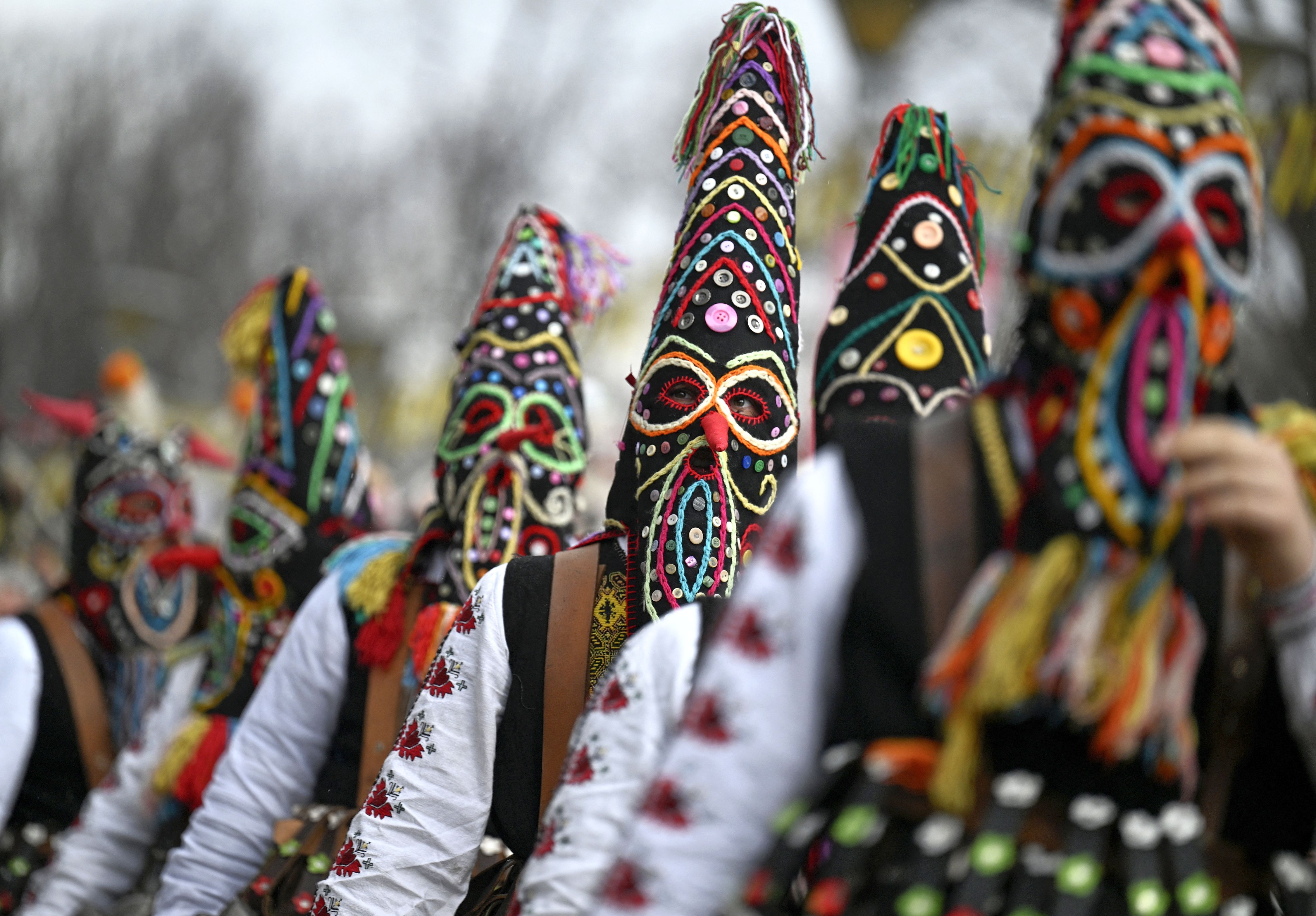 Bulgarian “Kukeri” dancers participate with their masks as they perform in the International Festival of the Masquerade Games in Pernik, near Sofia, on January 27, 2024. The Kukeri Carnival is a festival, which started on January 26, as participants wearing multi-coloured masks, covered with beads, ribbons and woollen tassels. The heavy swaying of the main mummer is meant to represent wheat heavy with grain, and the bells tied around the waist are intended to drive away the evil spirits and the sickness, on January 27, 2024. (Photo by Nikolay Doychinov/AFP Photo)