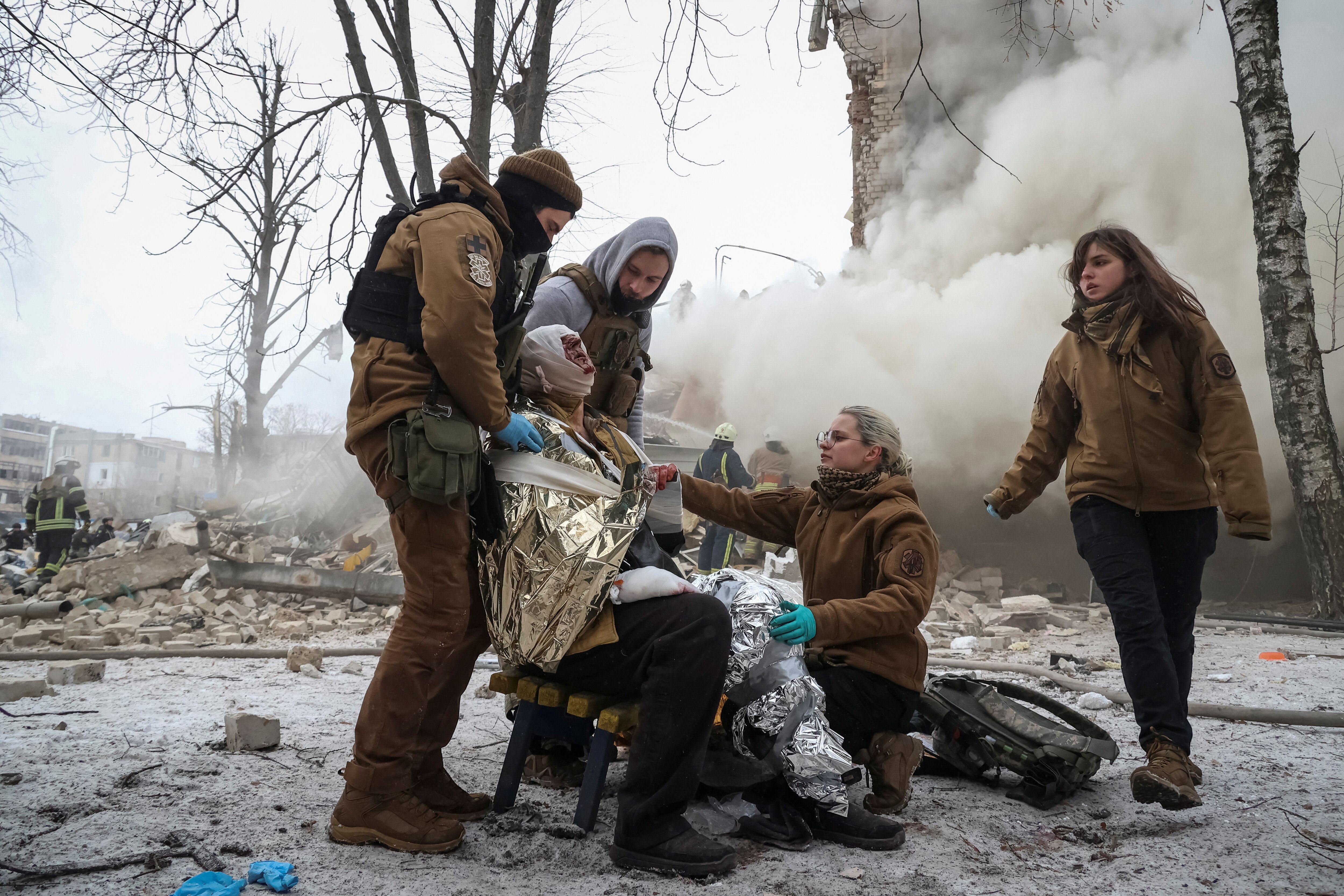 Medical workers treat a wounded local resident at a site of residential buildings heavily damaged during a Russian missile attack, amid Russia's attack on Ukraine, in Kharkiv, Ukraine on January 23, 2024. (Photo by Sofiia Gatilova/Reuters)