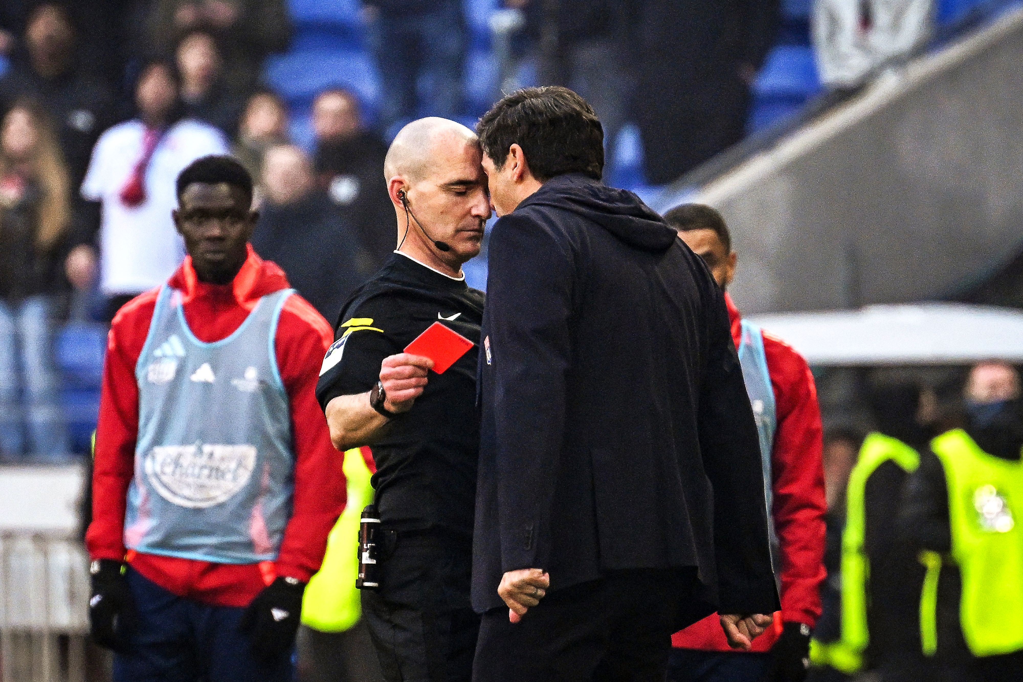 Lyon's Portuguese head coach Paulo Fonseca (R) yells at French referee Benoit Millot (L) after receiving a red card during the French L1 football match between Olympique Lyonnais (OL) and Stade Brestois 29 (Brest) at the Parc Olympique lyonnais in Decines-Charpieu, central-eastern France on March 2, 2025. Lyon coach Paulo Fonseca has been suspended from the bench and referee locker room until November 30 by the league's disciplinary committee on March 5, 2025, for a head-to-head threatening the referee of the Ligue 1 match OL-Brest (2-1), the committee chairman announced. (Photo by Jeff Pachoud/AFP Photo)