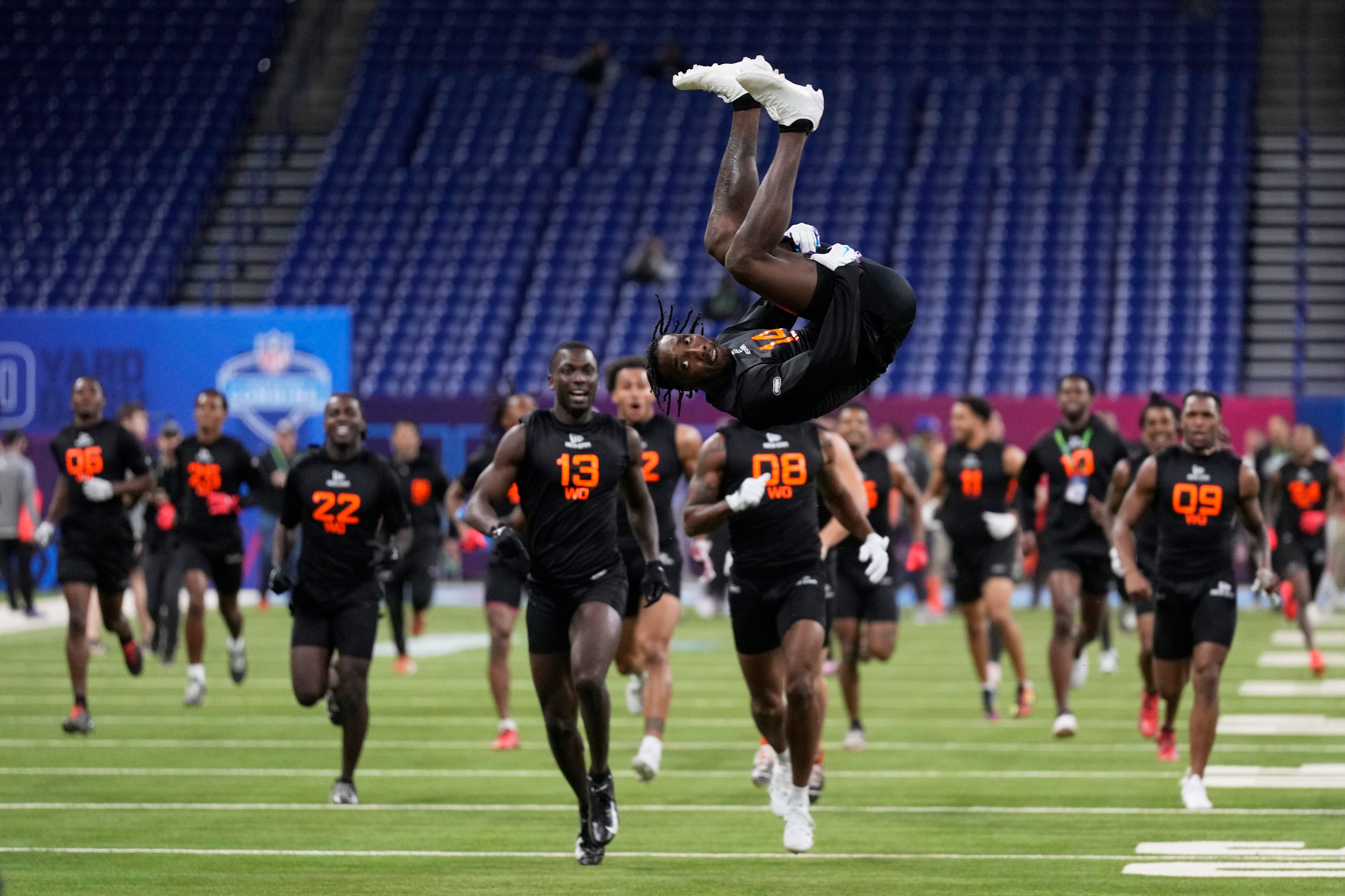 Maryland wide receiver Tai Felton does a backflip as wide receiver prospects run to the end zone to celebrate after running drills at the NFL football scouting combine in Indianapolis, Saturday, March 1, 2025. (Photo by George Walker IV/AP Photo)
