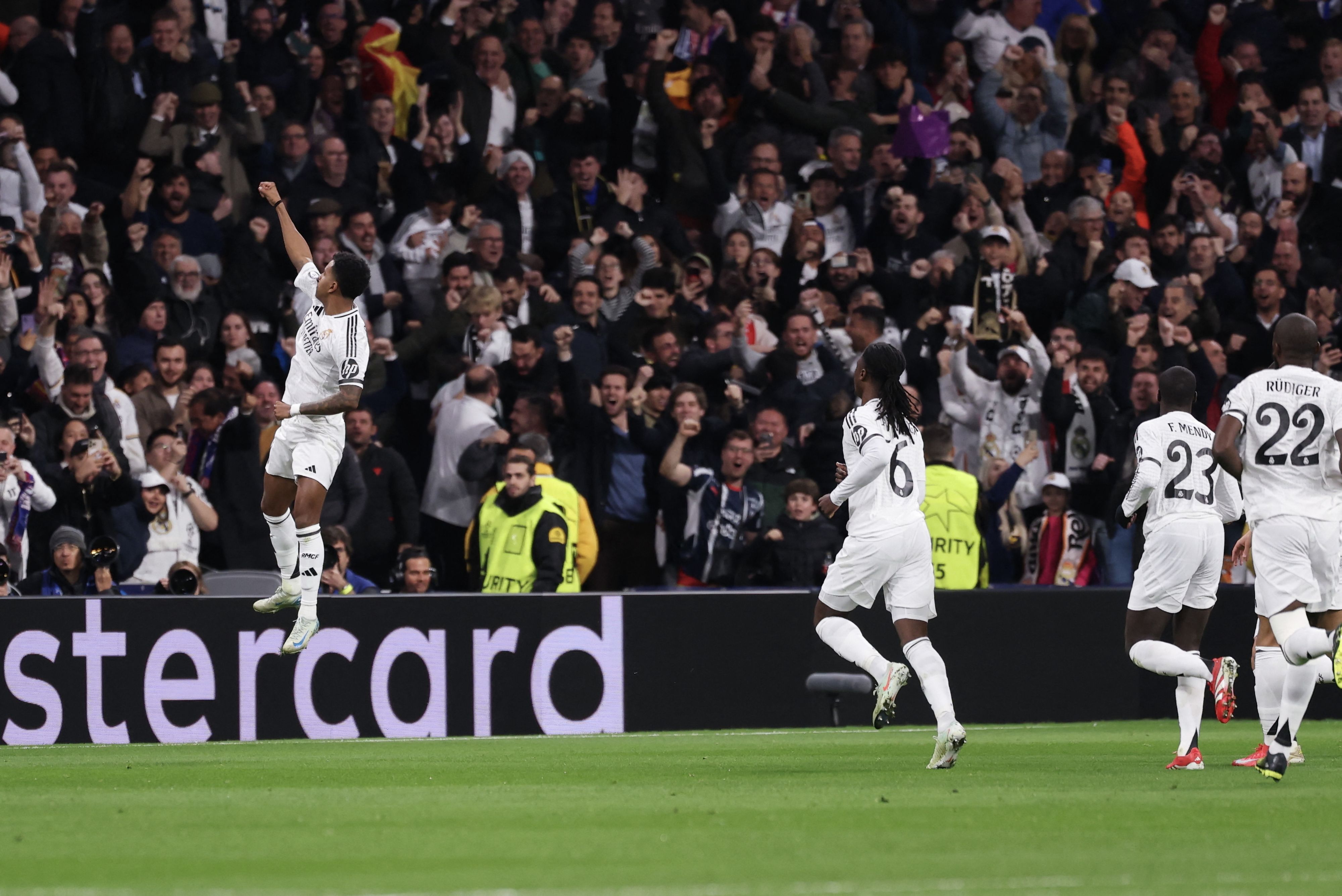 Real Madrid's Brazilian forward #11 Rodrygo (L) celebrates scoring their first goal during the UEFA Champions League Round of 16 first leg football match between Real Madrid CF and Club Atletico de Madrid at the Santiago Bernabeu stadium in Madrid, on March 4, 2025. (Photo by Thomas Coex/AFP Photo)