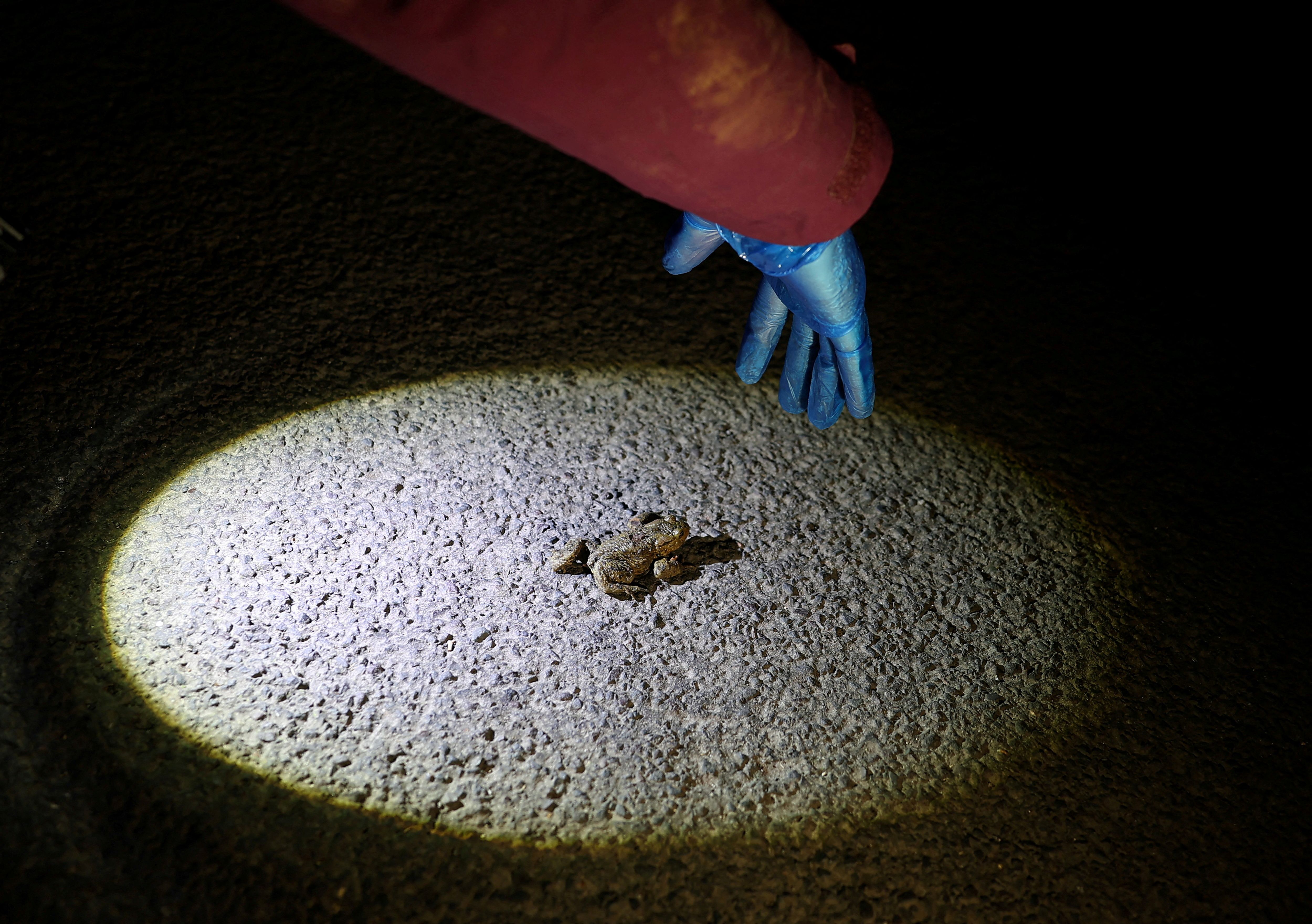 Volunteer Sheila from the Charlcombe Toad Rescue Group and Froglife prepares to assist a common toad across a road during the annual migration to a nearby breeding lake, in Bath, Britain, on March 6, 2025. The seasonal closure of Charlcombe Lane has played a crucial role in helping keep the local population of amphibians stable over the past twenty years. (Photo by Toby Melville/Reuters)