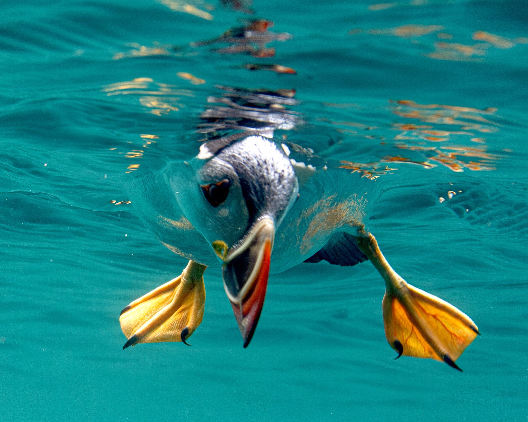 A puffin, which is an endangered species, pokes its head into the turquoise waters off Skomer Island, Wales, UK early March 2025, to hunt for its fish supper. (Photo by David Miller/Solent News & Photo Agency)