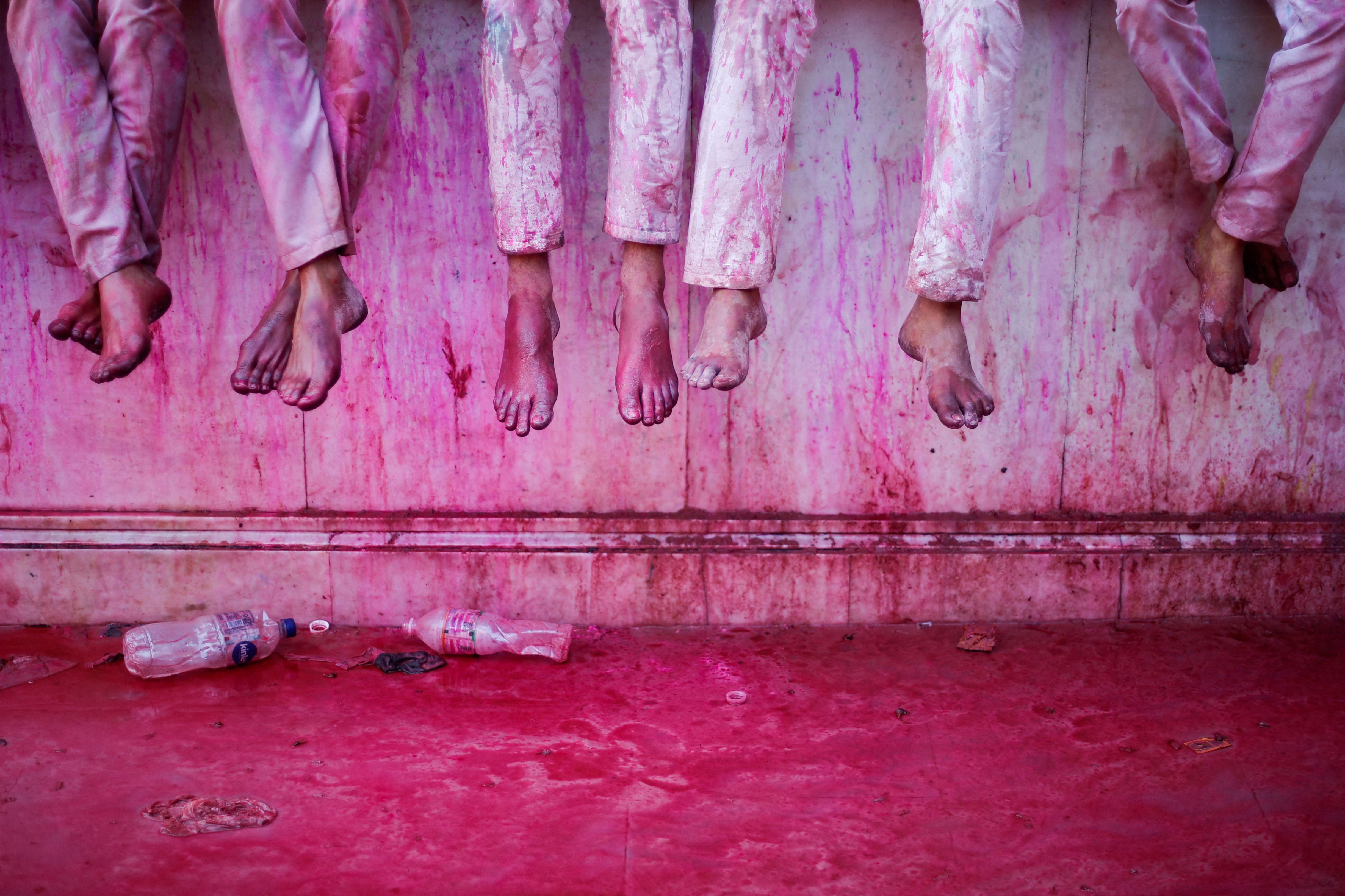 Hindu devotees take part in the religious festival of Holi inside a temple in Nandgaon, in the state of Uttar Pradesh, India, on March 9, 2025. (Photo by Adnan Abidi/Reuters)