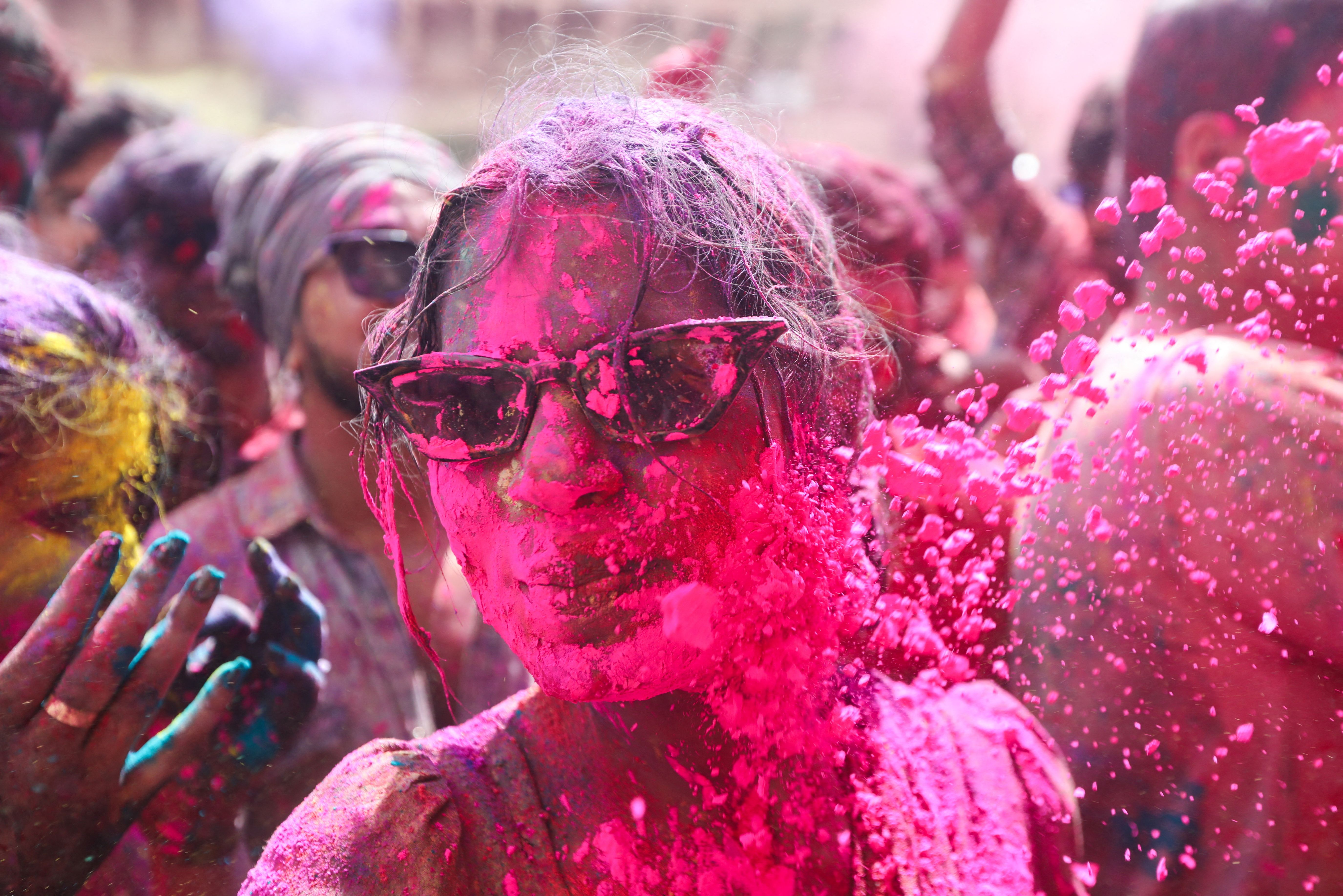 A Hindu devotee takes part in the religious festival of Holi inside a temple in Nandgaon village, in the state of Uttar Pradesh, India, on March 9, 2025. (Photo by Adnan Abidi/Reuters)