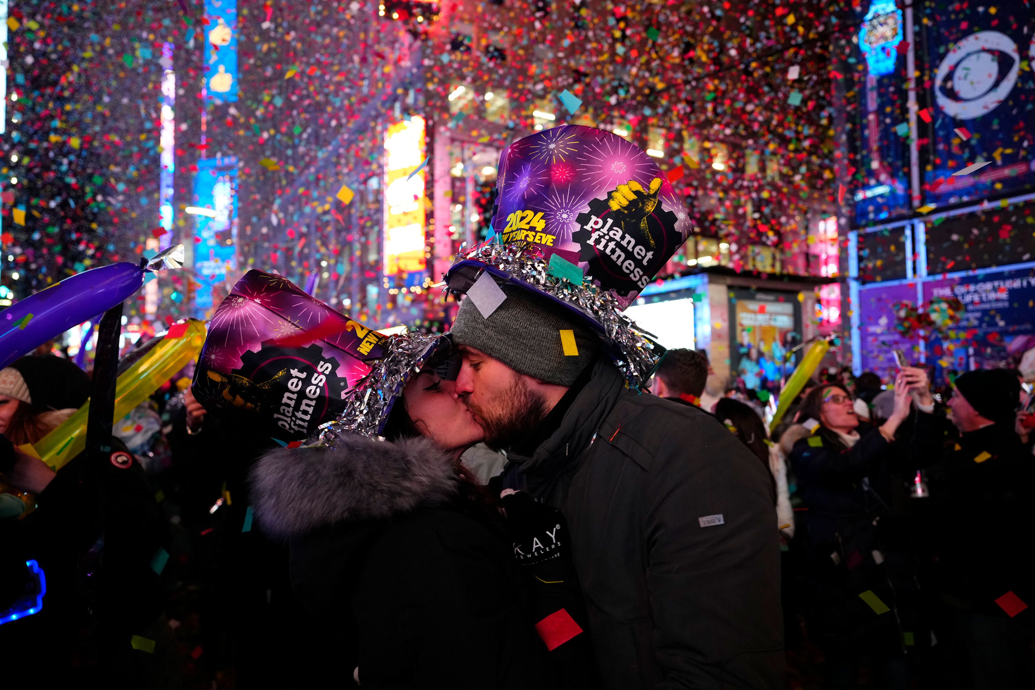 Revelers celebrate New Year's in Times Square on January 01, 2024 in New York City. Around 1 million people are estimated to fill Times Square, alongside a large police presence amid concerns about protests targeting the event. (Photo by Adam Gray/Getty Images)