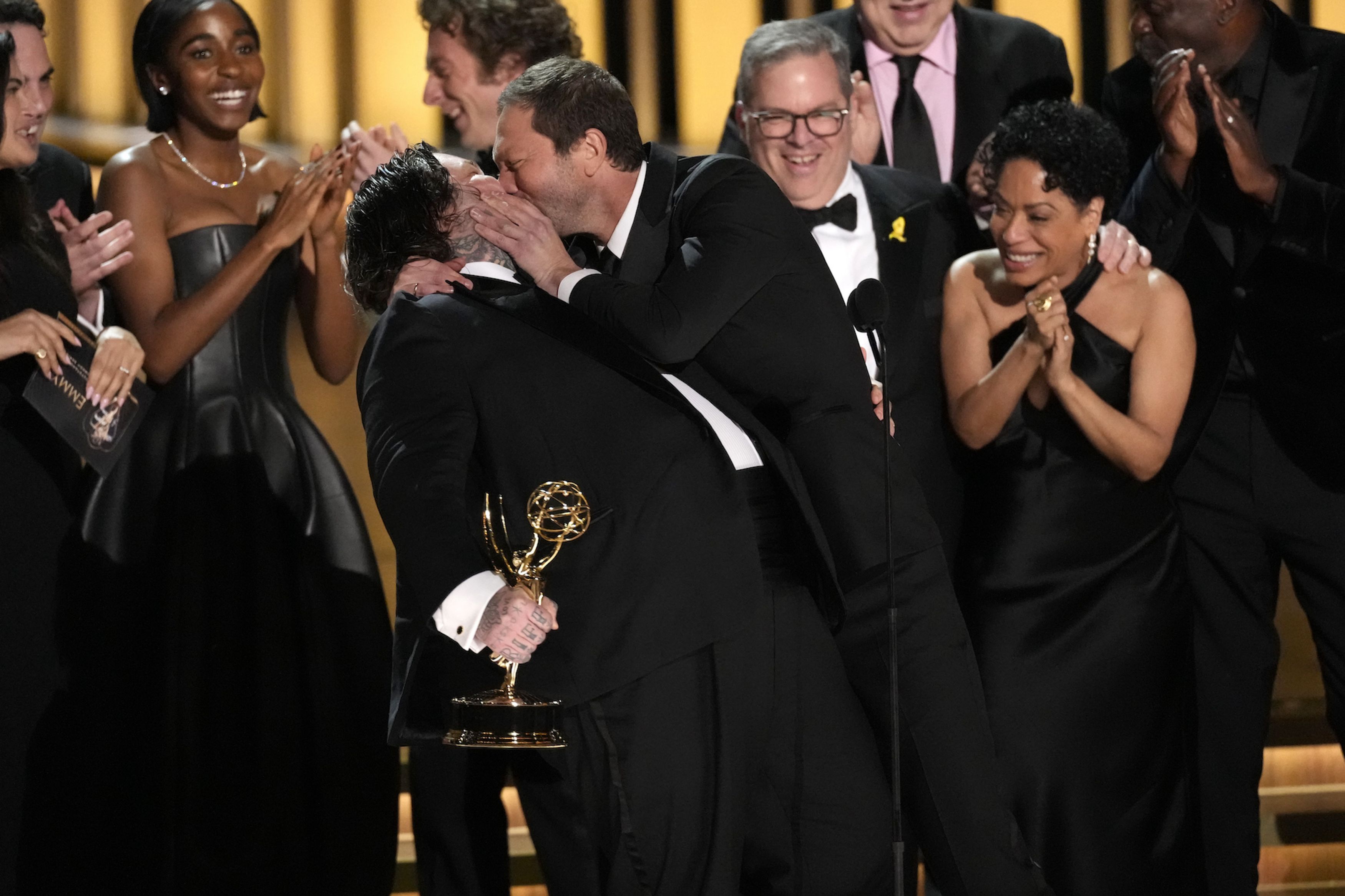 Actors Matty Matheson, center, and Ebon Moss-Bachrach kiss as “The Bear” wins the award for outstanding comedy series during the 75th Primetime Emmy Awards on Monday, January 15, 2024, at the Peacock Theater in Los Angeles. (Photo by Chris Pizzello/AP Photo)