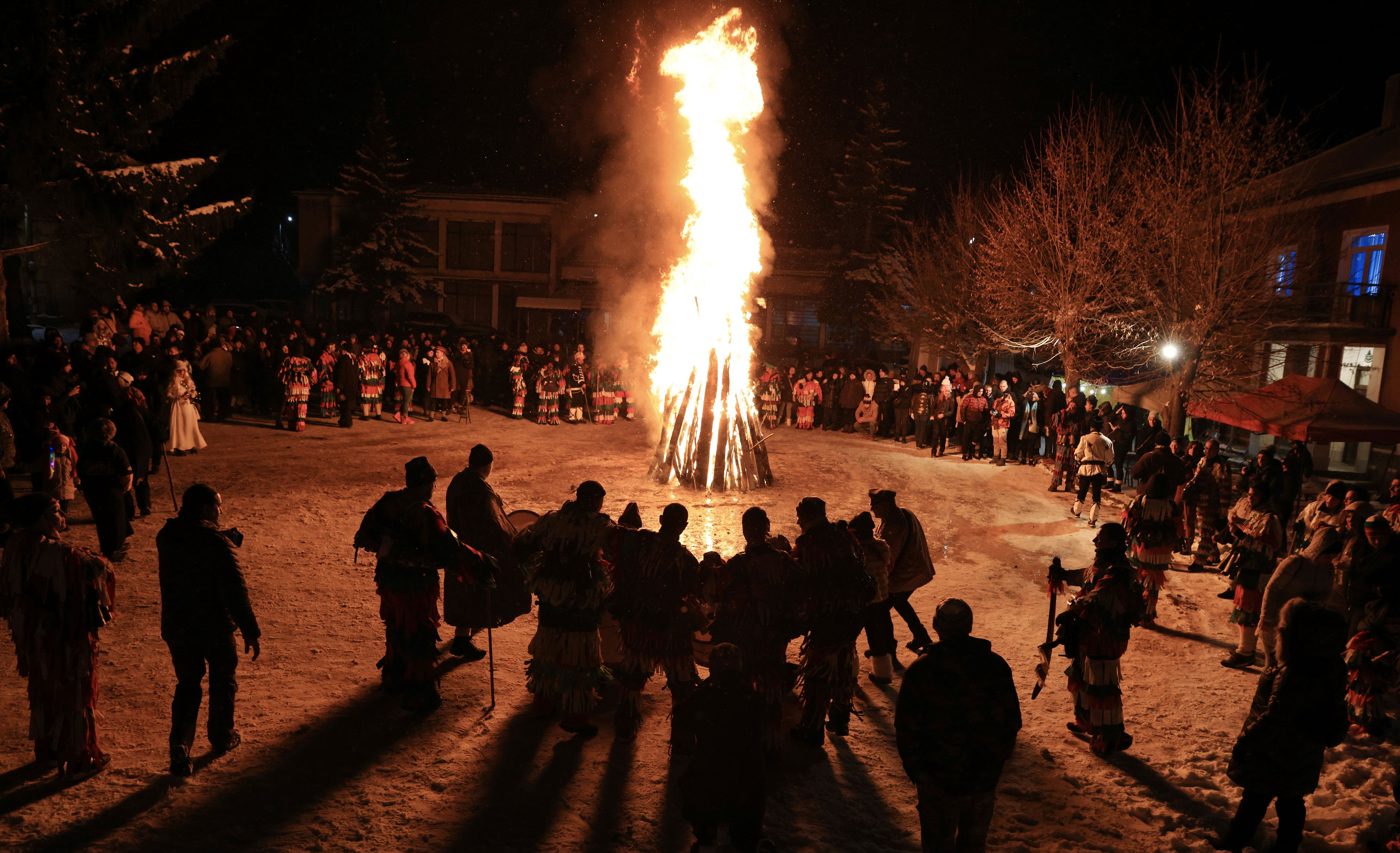 Costumed people, a so-called “Kuker” mask dancer, perform a traditional dance during carnival celebrations of Surva in the village of Elovdol, Bulgaria, 13 January 2025. In ancient times, the old Thracians held the Kukeri Ritual Games in honor of god Dionysus - known as a god of wine and ecstasy. Among the Kukeri (singular: kuker) dancers' are many characters, including Dionysus and his satyrs as well as others from deep history such as the tsar, harachari, plyuvkachi, startzi, and pesyatzi. (Photo by Vassil Donev/EPA/EFE)