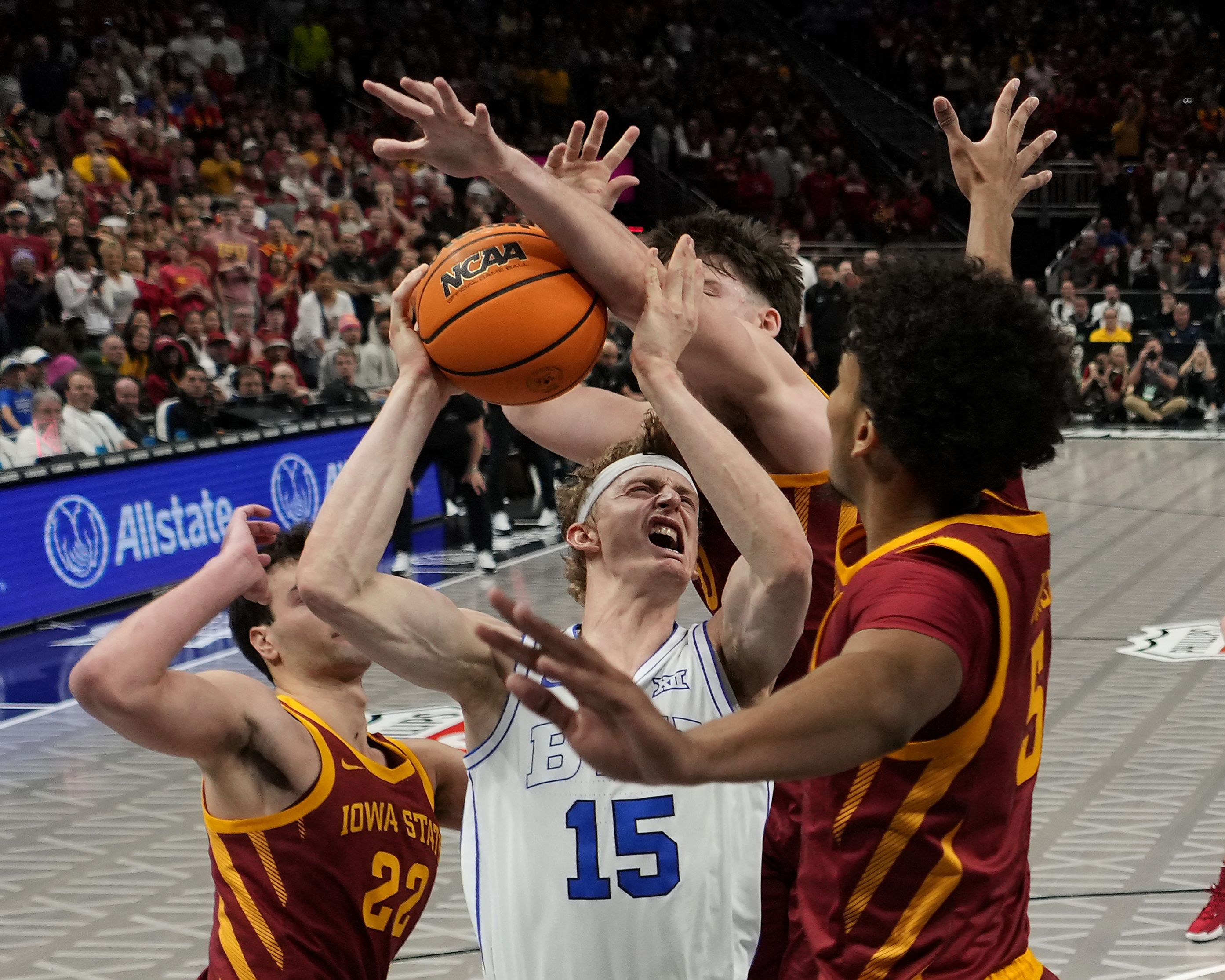 Brigham Young forward Richie Saunders (15) looks to shoot under pressure from Iowa State forward Milan Momcilovic (22), guard Nate Heise, back, and guard Curtis Jones (5) during the second half of an NCAA college basketball game in the Big 12 men's tournament Thursday, March 13, 2025, in Kansas City, Mo. (Photo by Charlie Riedel/AP Photo)