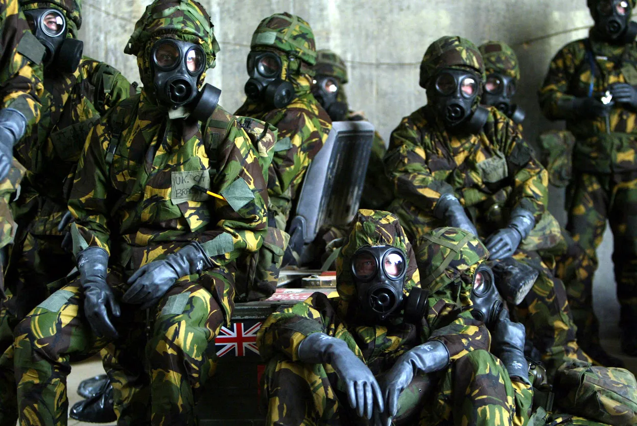 British Royal Air Force personnel wait in a bunker wearing full Nuclear Biological and Chemical suits after a warning of a Scud missile attack on their base in Kuwait March 20, 2003. (Photo by Russell Boyce/Reuters via The Atlantic)