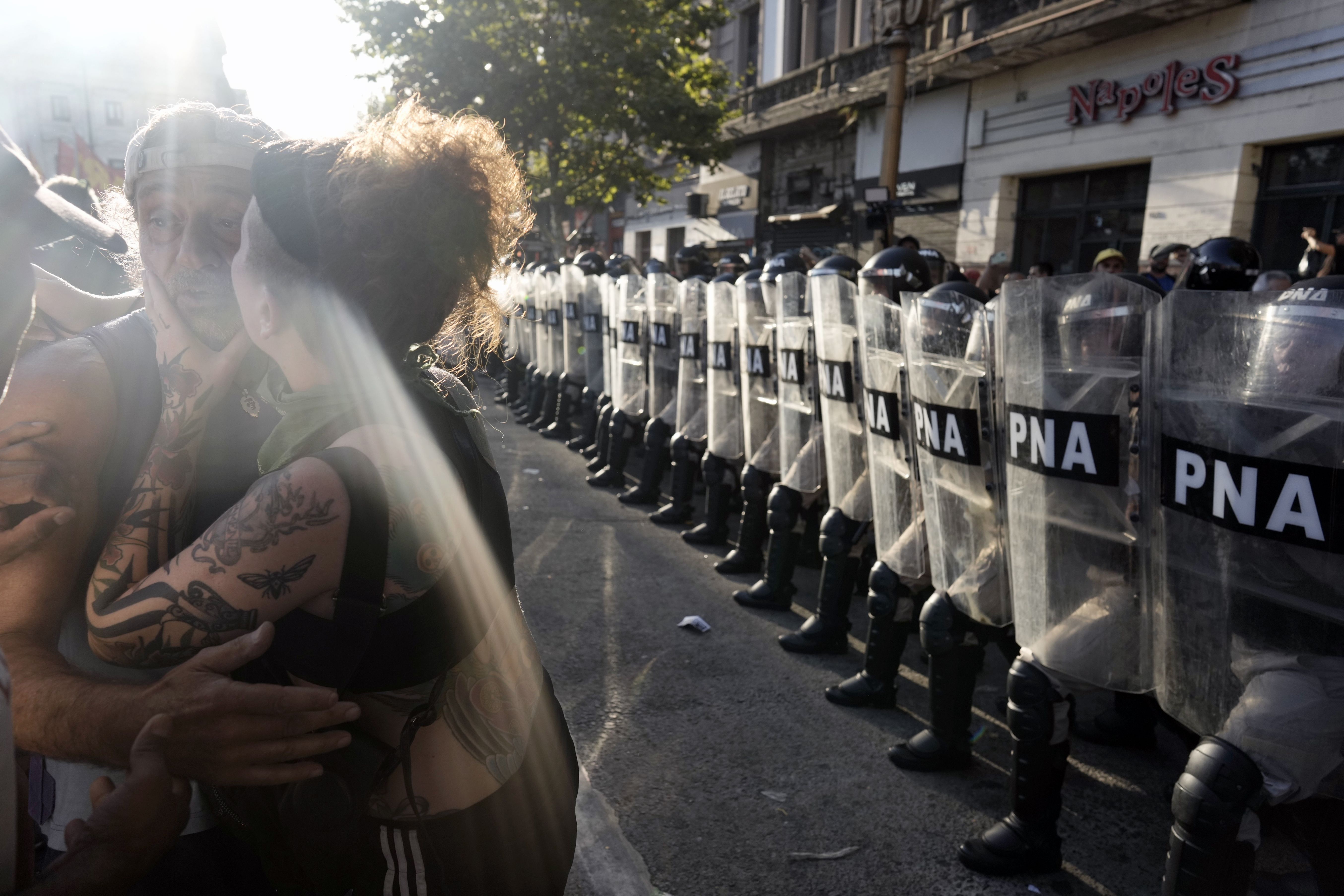 Riot police stand in a phalanx formation as people protest outside Congress where lawmakers are debating a bill promoted by Argentine President Javier Milei in Buenos Aires, Argentina, Wednesday, January 31, 2024. The bill includes a broad range of economic, administrative, criminal and environmental reforms. (Photo by Rodrigo Abd/AP Photo)
