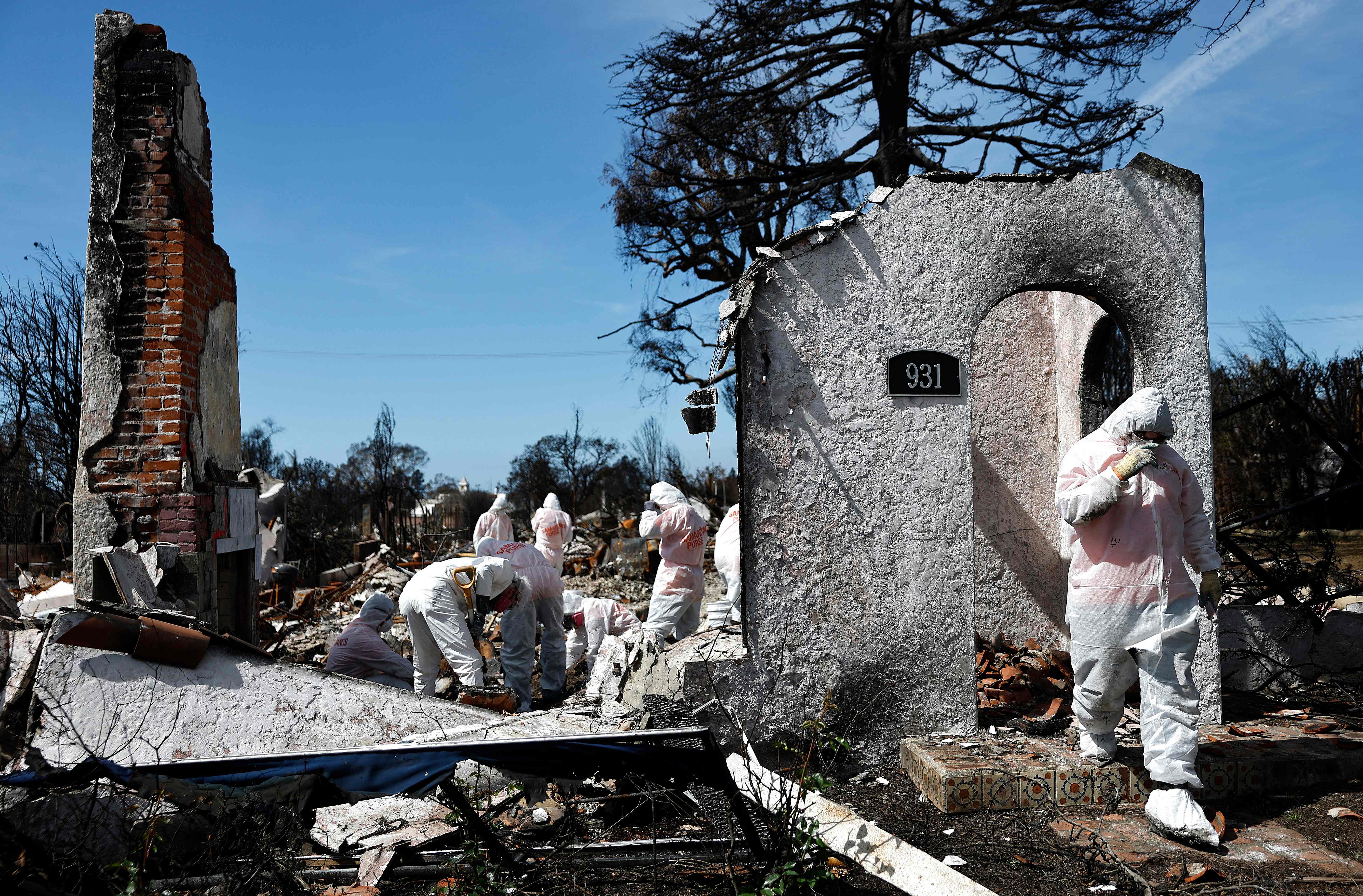 Volunteers with Samaritan's Purse help homeowner Dennis Higgins (NOT PICTURED) search for meaningful personal items in the remains of his home which burned in the Palisades Fire on March 15, 2025 in Pacific Palisades, California. Higgins and his wife Nicole had lived in the home for about 30 years. Over 16,000 structures were destroyed in the Palisades and Eaton fires. (Photo by Mario Tama/Getty Images/AFP Photo)