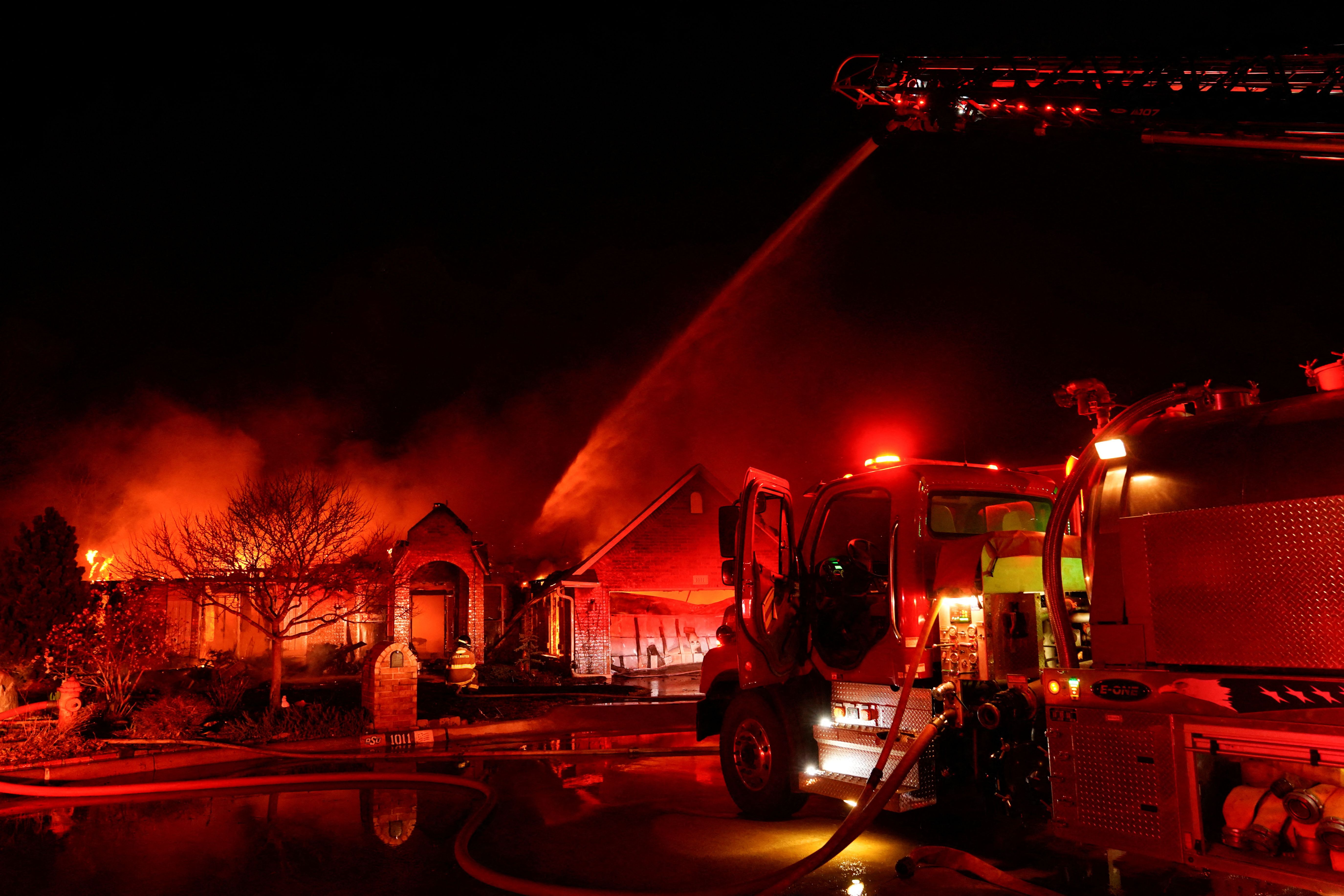 Firefighters battle a fire burning a house during a wildfire outbreak in Stillwater, Oklahoma, on March 14, 2025. (Photo by Nick Oxford/Reuters)