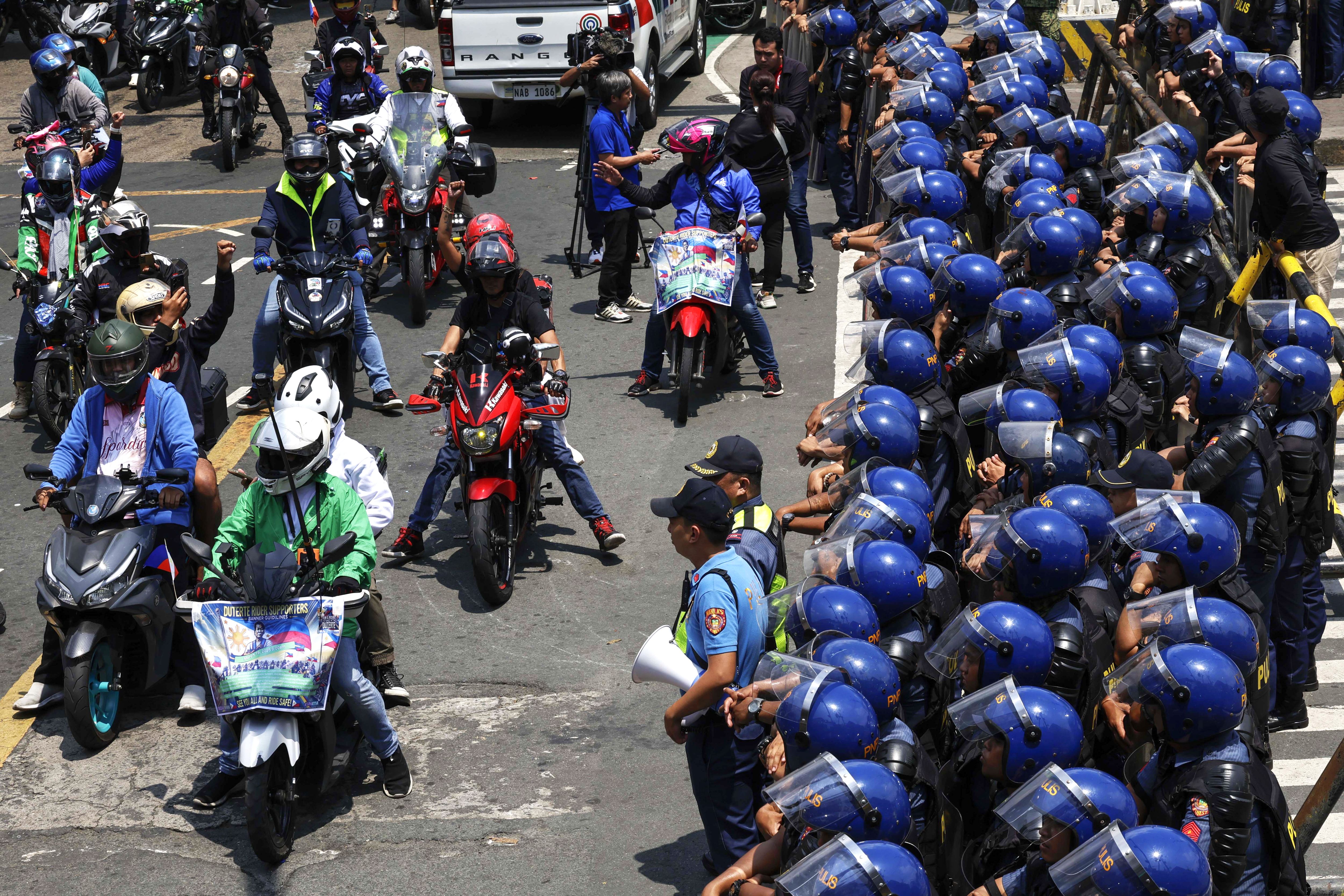 Police personnel standing guard (R) look on as supporters of former Philippine president Rodrigo Duterte continue their motorcade calling for the return of the former leader, in Manila, Philippines, 16 March 2025. Duterte, who is being held in Scheveningen prison in the Netherlands, is facing charges of crimes against humanity before the International Criminal Court (ICC) following investigations into a war on drugs campaign that resulted in thousands of alleged extrajudicial killings during his presidency. (Photo by Rolex Dela Pena/EPA)