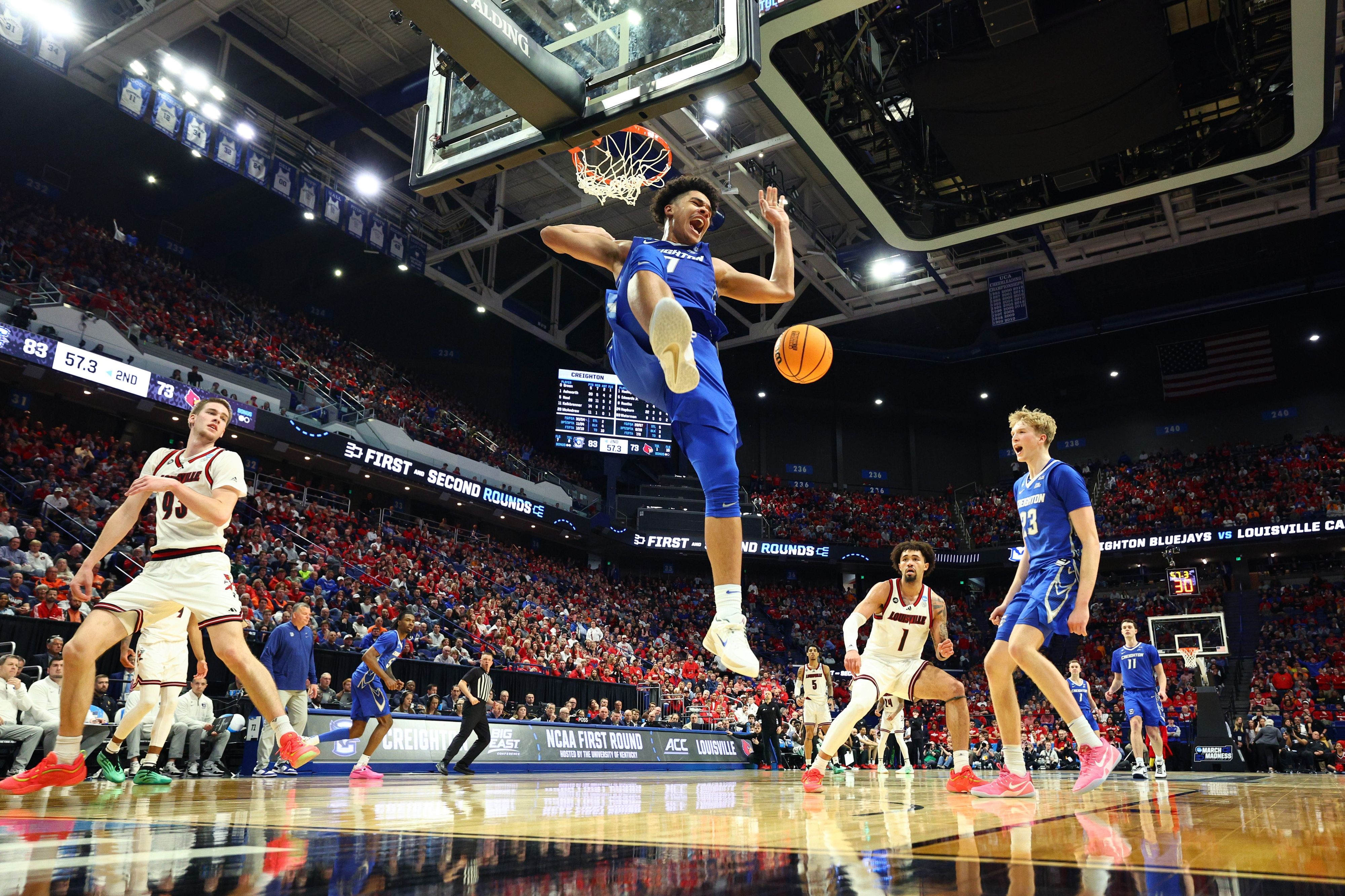 Jasen Green #0 of the Creighton Bluejays dunks the ball in the second half against the Louisville Cardinals in the first round of the NCAA Men's Basketball Tournament at Rupp Arena on March 20, 2025 in Lexington, Kentucky. (Photo by Andy Lyons/Getty Images)