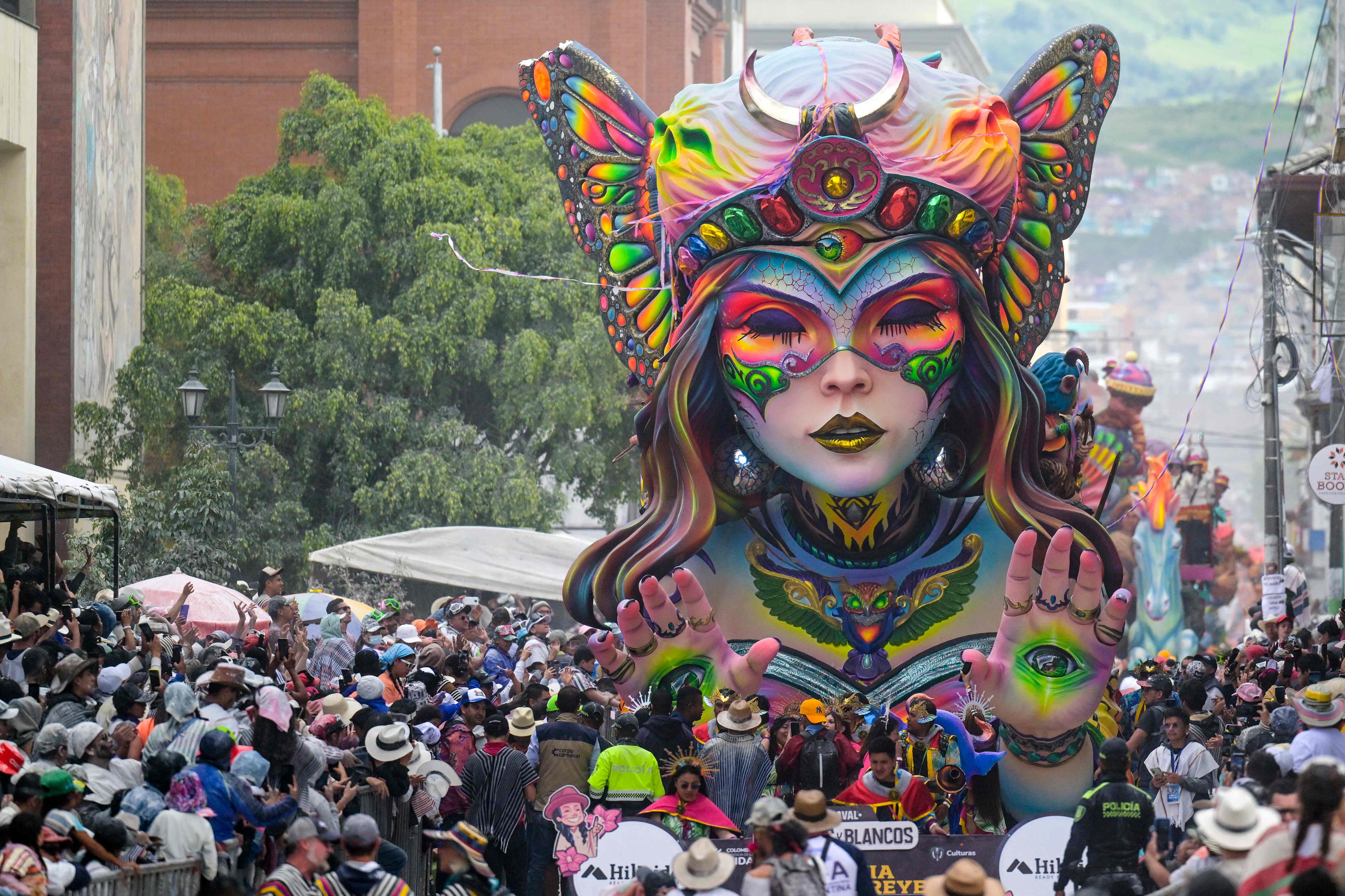 A float is seen during the “White Day” parade during the Carnival of Blacks and Whites in Pasto, Colombia on January 6, 2024. The Blacks and Whites carnival has its origins in a mix of Andean, Amazonian and Pacific cultural expressions, and it celebrates the ethnic diversity in the region and was proclaimed by UNESCO as intangible cultural heritage in 2009. (Photo by Joaquín Sarmiento/AFP Photo)
