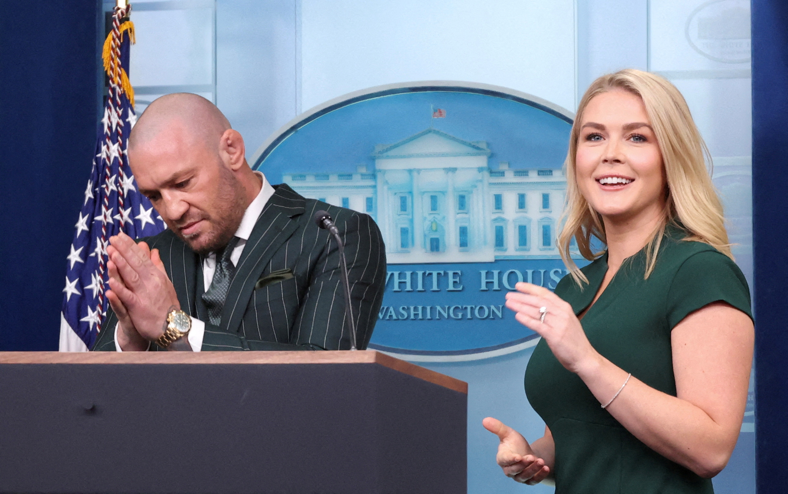Irish UFC fighter Conor McGregor stands at the briefing room lectern, with White House press secretary Karoline Leavitt at his side, during a visit to the White House on March 18, 2025. (Photo by Kevin Lamarque/Reuters)