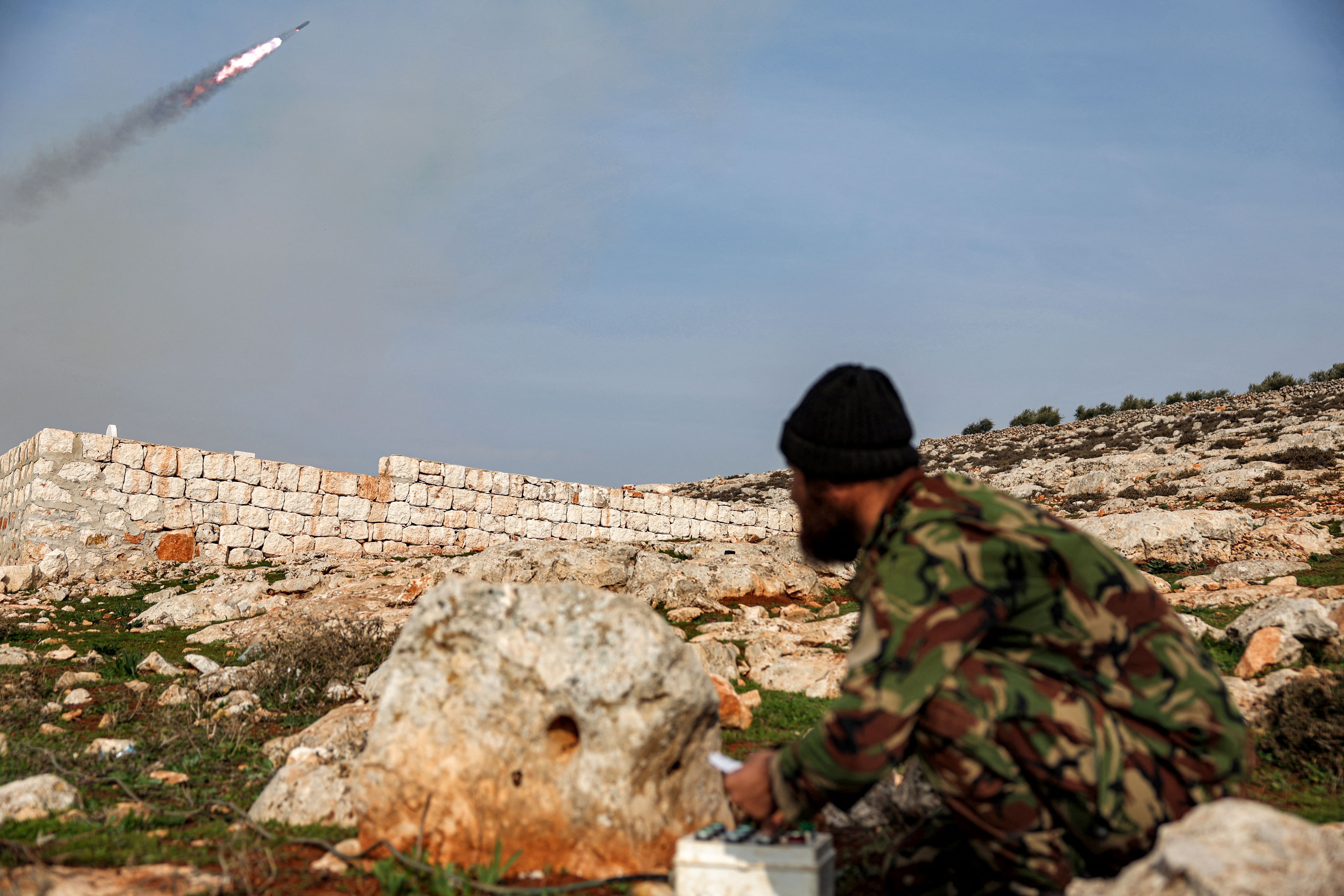 A Syrian fighter affiliated with the Hayat Tahrir al-Sham (HTS) group operates the remote for a pickup-mounted rocket launcher firing at Syrian government forces' positions in the northwest of Aleppo province on January 1, 2024. (Photo by Omar Haj Kadour/AFP Photo)