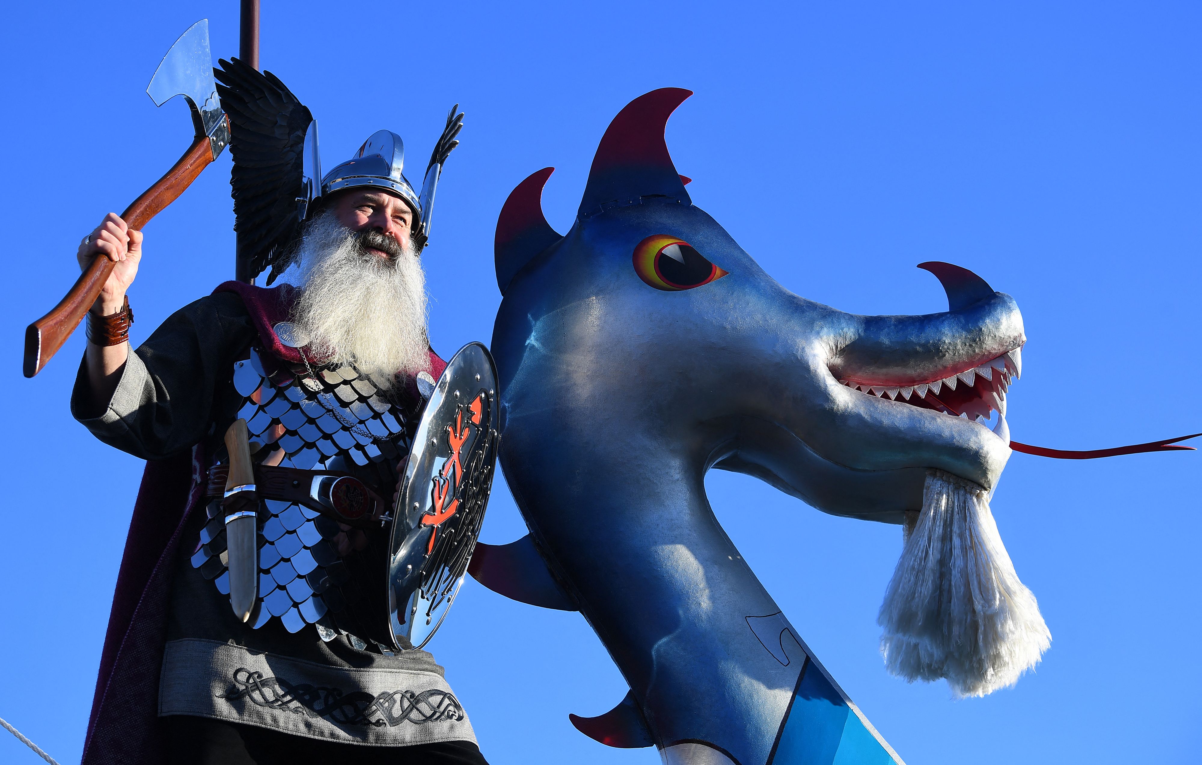 Guizer Jarl Richard Moar poses with members of the Up Helly Aa “Jarl Squad”, before parading through the streets of in Lerwick, Shetland Islands on January 31, 2024 before the Up Helly Aa festival later in the day. Up Helly Aa celebrates the influence of the Scandinavian Vikings in the Shetland Islands and culminates with up to 1,000 “guizers” (men in costume) throwing flaming torches into their Viking longboat and setting it alight later in the evening. (Photo by Andy Buchanan/AFP Photo)