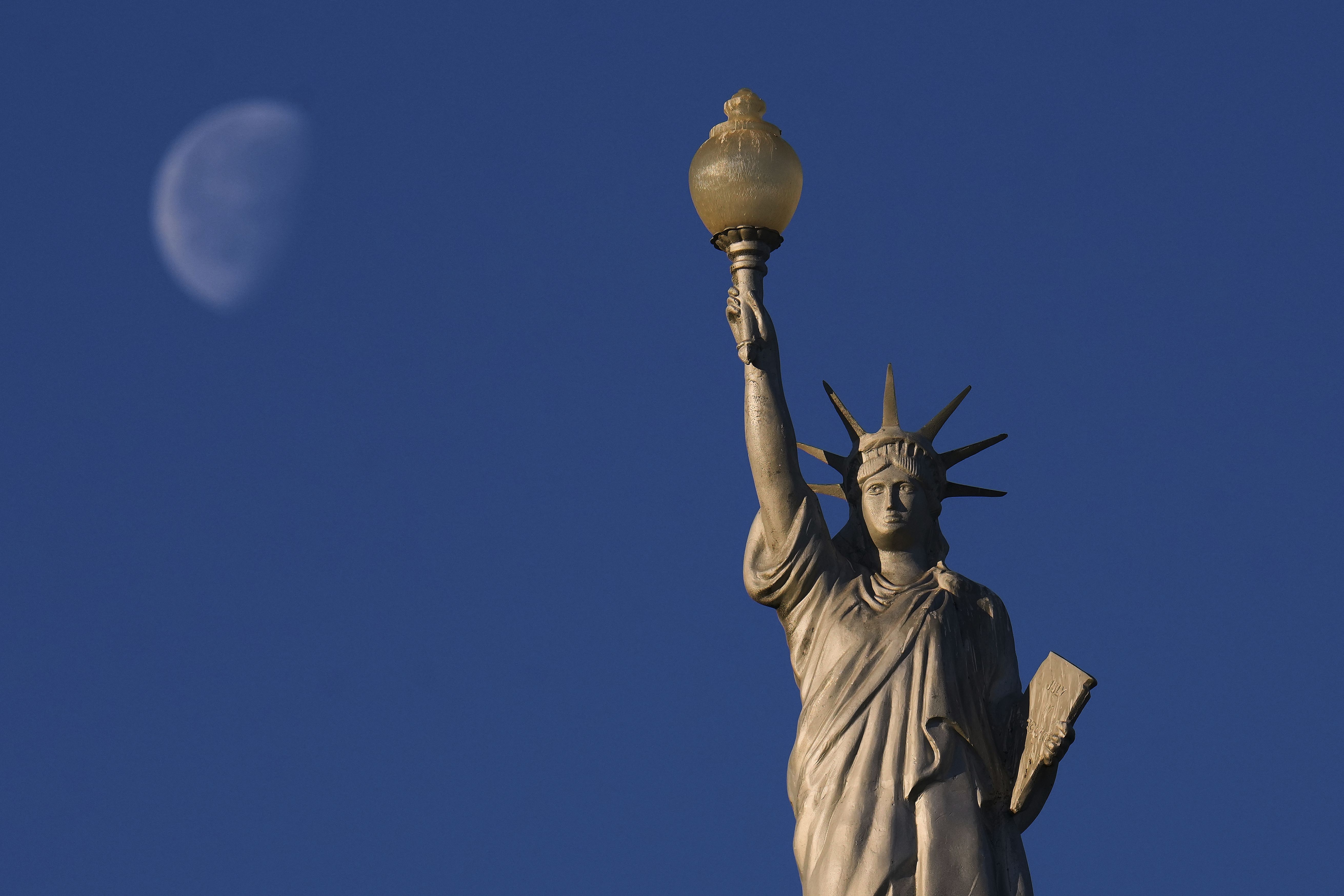 A replica of the Statue of Liberty stands at an RV Park in Waco, Texas, as the moon is in its waning gibbous stage, Thursday, March 20, 2025. (Photo by Julio Cortez/AP Photo)