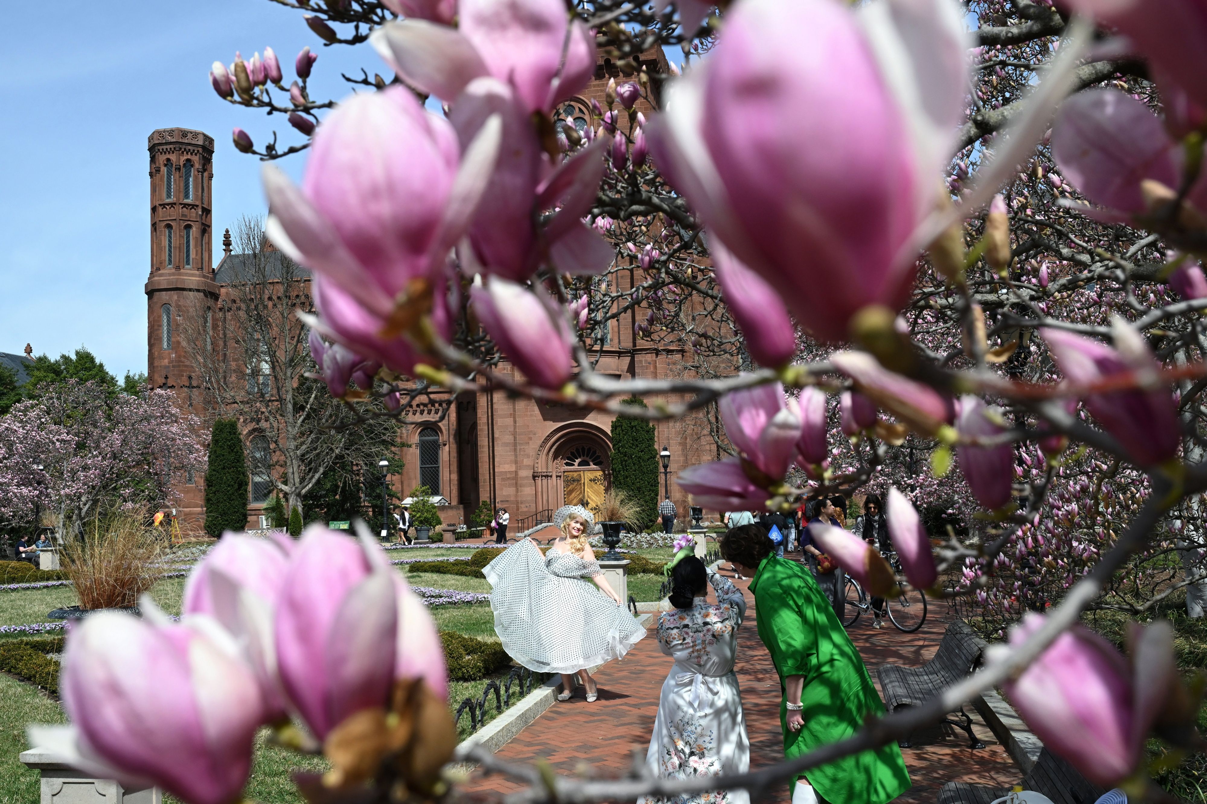 Lilia Forbang, center, has her photo taken while posing among blooming magnolia trees outside the Smithsonian Castle in Washington on March 19, 2025. (Photo by Matt McClain/The Washington Post)