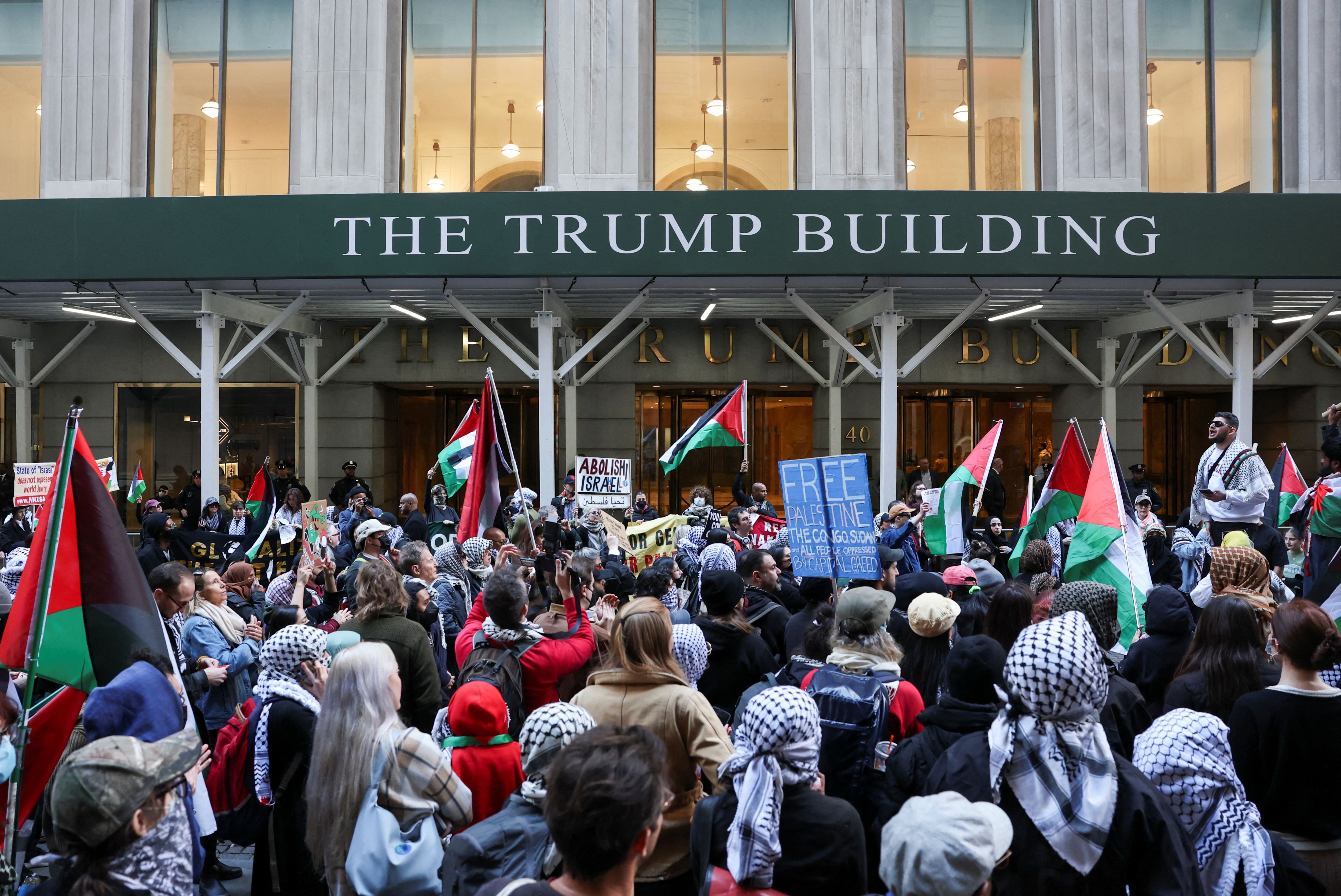 Pro-Palestinian demonstrators protest outside the Trump Building, in the financial district of lower Manhattan, in New York City on March 19, 2025. (Photo by Jeenah Moon/Reuters)