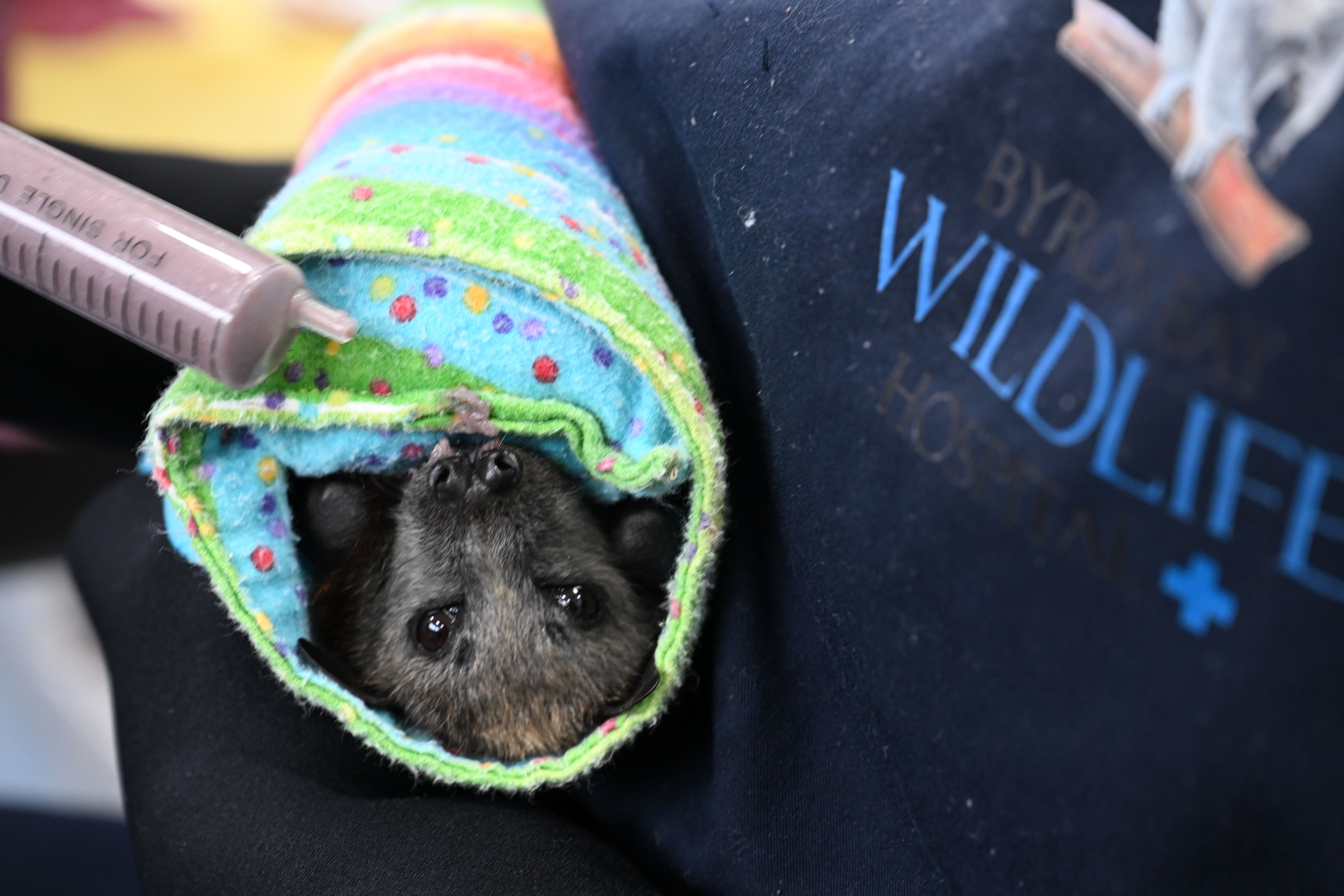 Vet staff tend to an injured flying fox with some urgently required food after being found injured in the cyclone on March 09, 2025 in Byron Bay, Australia. Australia's east coast is experiencing severe weather as ex-Tropical Cyclone Alfred moves south. While downgraded from cyclone status, the weather system continues to bring damaging winds, heavy rainfall, and flash flooding, particularly in the Gold Coast and northern NSW regions. Environmental charity Byron Bay Wildlife Hospital today reopened its doors to a flood of patients impacted by the destructive weather event. Working with local wildlife rescue groups, during the first few hours of re-opening native animal patients included an injured koala, an eastern grey kangaroo, a Flying fox, Sea Turtle hatchlings and a Swamp hen. Since 2020, the charity organisation operates a fully licensed veterinary hospital for sick, injured and orphaned wildlife. Reliant on donations, the hospital’s service is free of charge. (Photo by James D. Morgan/Getty Images)
