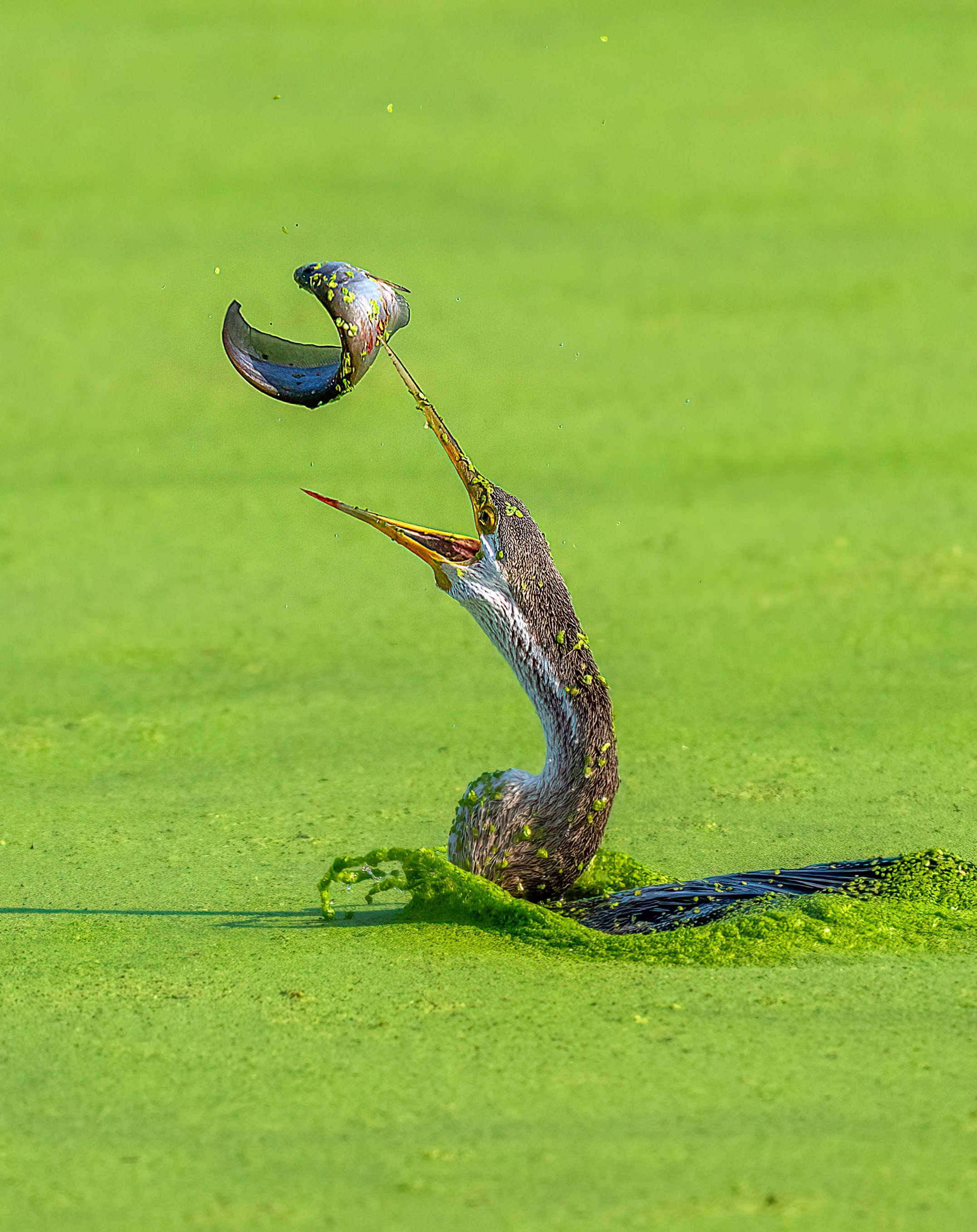 A darter bird makes a stab at dinner in Rajasthan, India in the second decade of March 2025. (Photo by Anuj Jain/Solent News & Photo Agency)