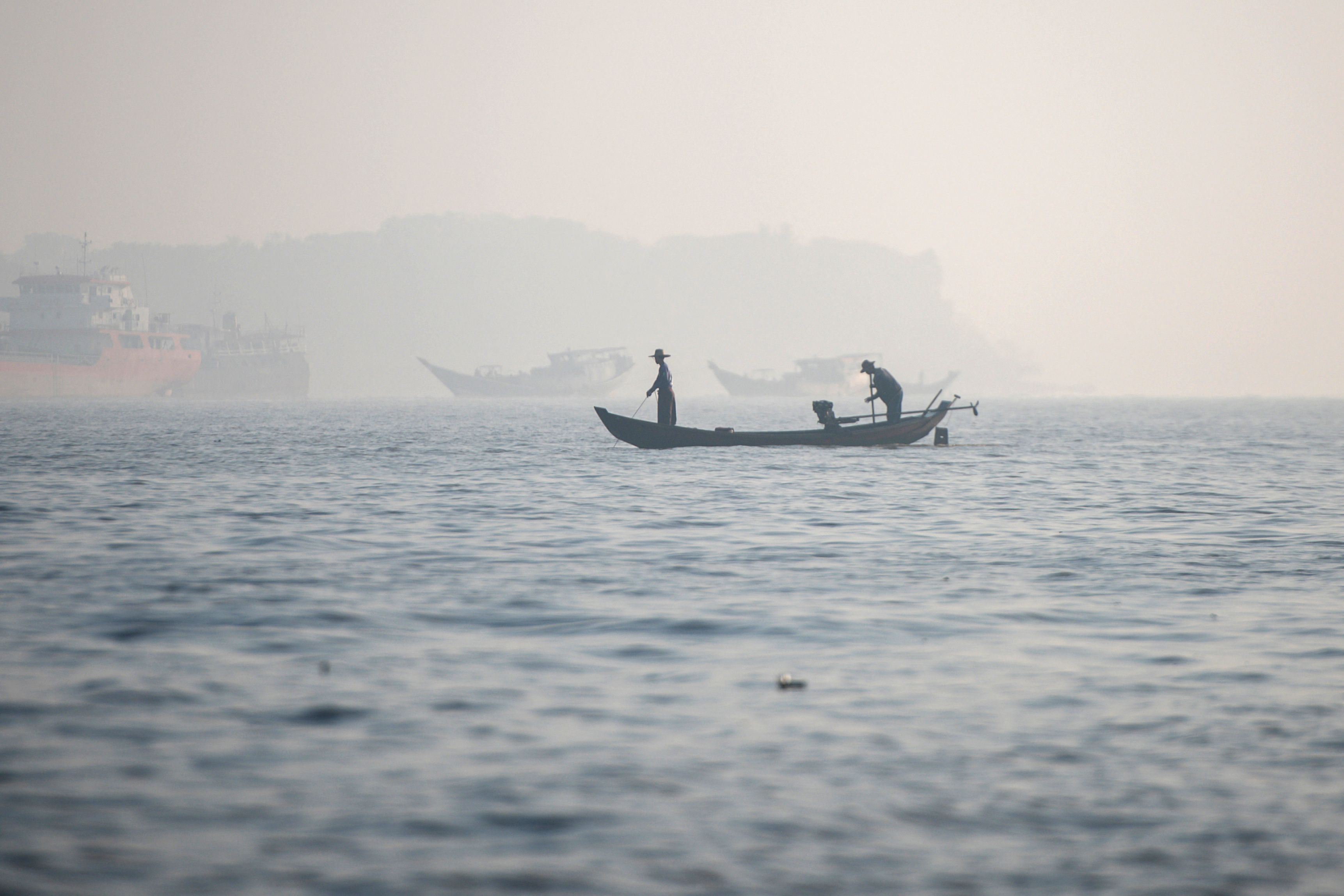 Fishermen on a boat haul in their net on the Yangon river amid heavy air pollution in Yangon on January 25, 2025. (Photo by Sai Aung Main/AFP Photo)