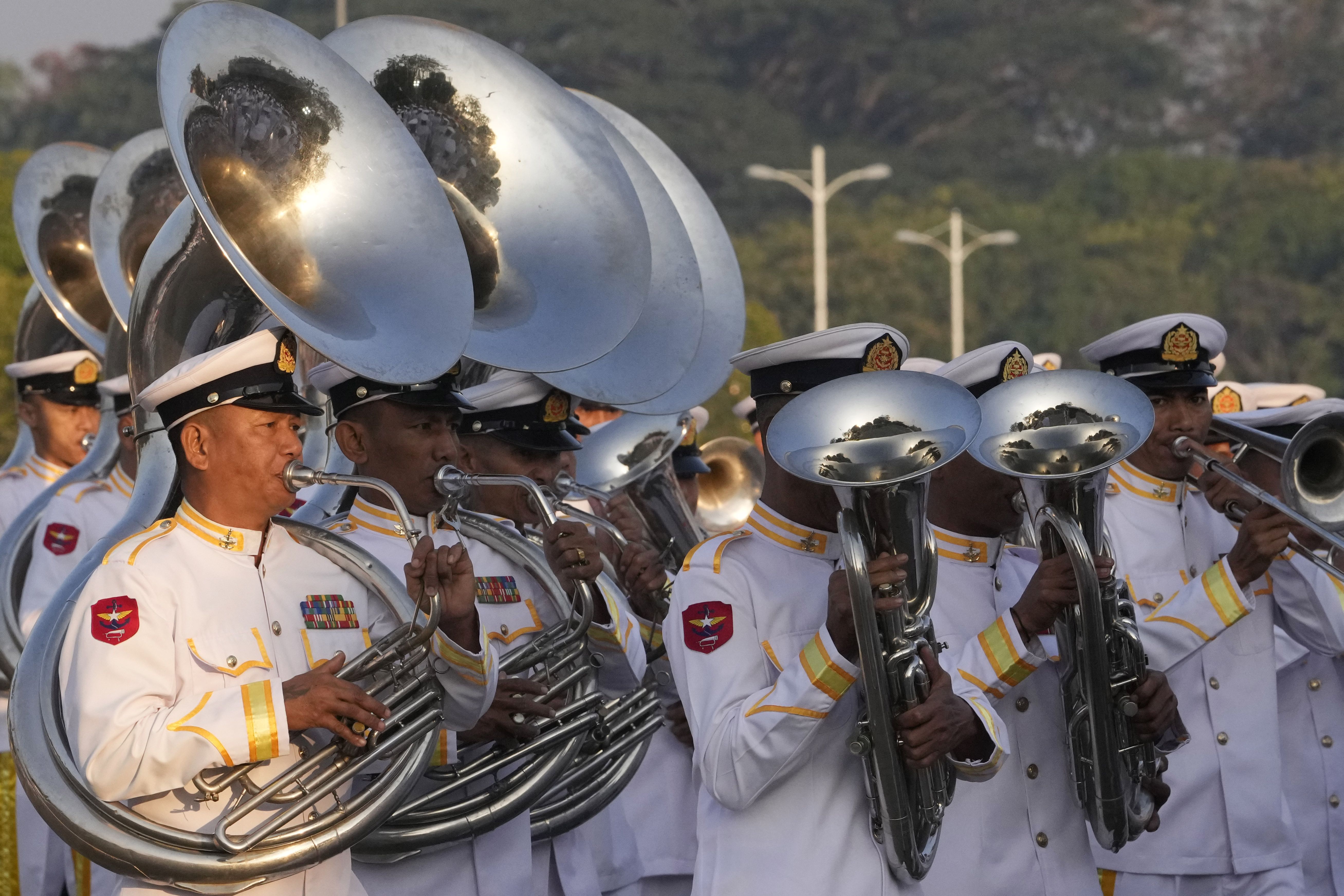 A military band marches during a ceremony to mark Myanmar's 78th anniversary of Union Day in Naypyitaw, Myanmar, Wednesday, February 12, 2025. (Photo by Aung Shine Oo/AP Photo)