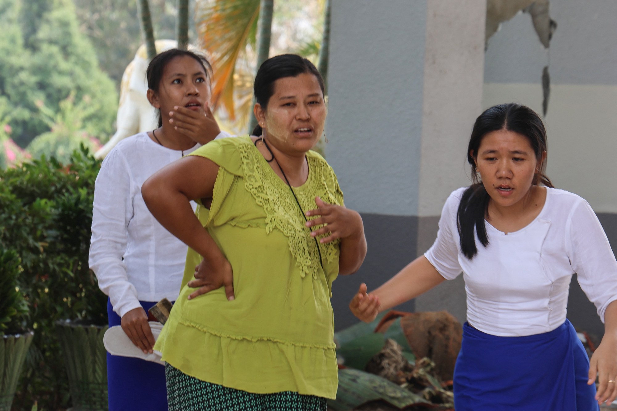 Women react outside the National Museum in Naypyidaw on March 28, 2025, after an earthquake in central Myanmar. A powerful earthquake hit Myanmar and neighbouring Thailand on March 28, turning a major hospital in the Burmese capital into a “mass casualty area” and trapping dozens of workers in an under-construction skyscraper in Bangkok. (Photo by Sebastien Berger/AFP Photo)