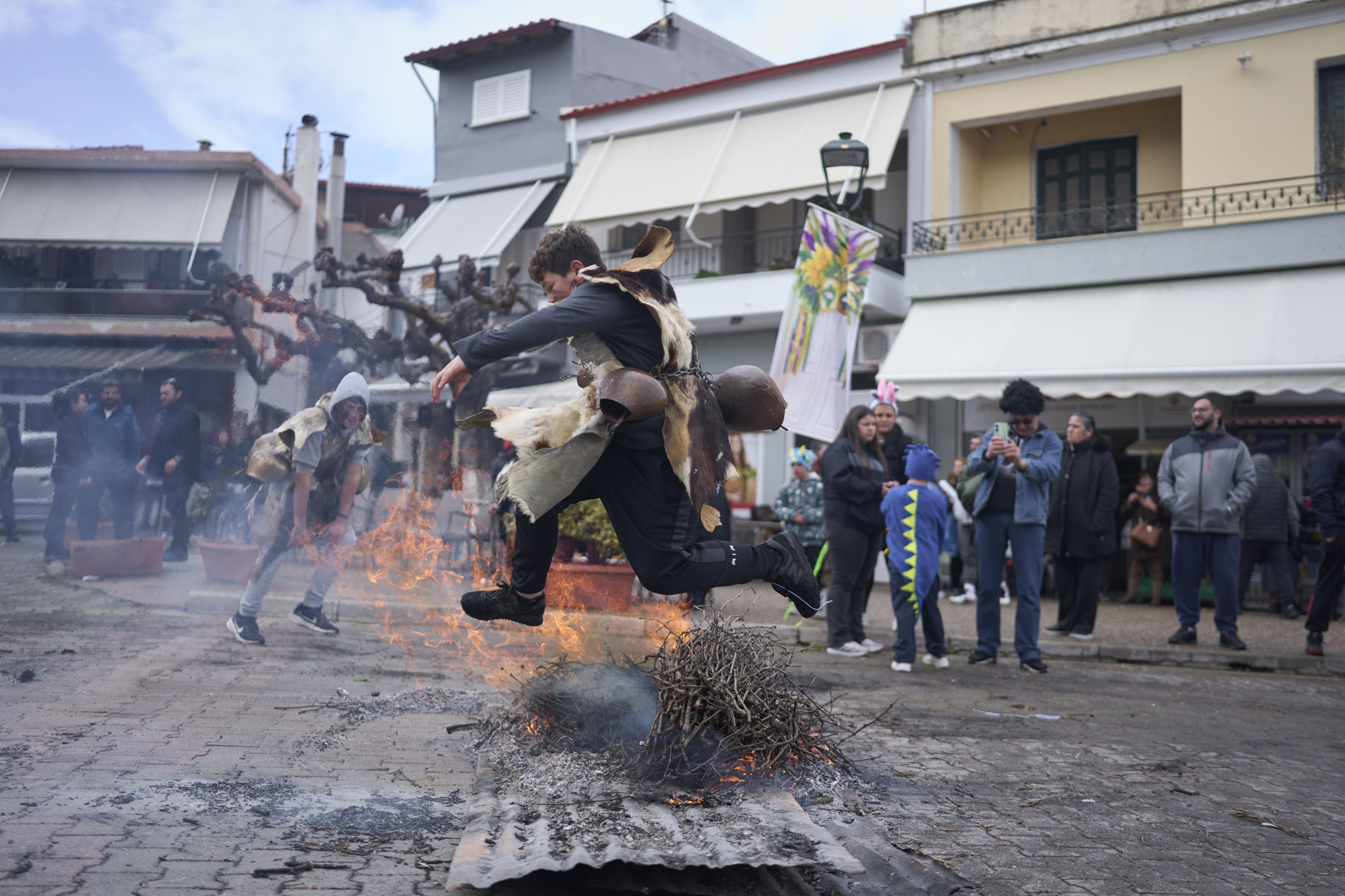 A boy dressed in animal skins and heavy bronze bells, jumps over a burning carnival effigy during carnival celebrations in Distomo, a village in central Greece, on Monday, March 3, 2025. (Photo by Petros Giannakouris/AP Photo)
