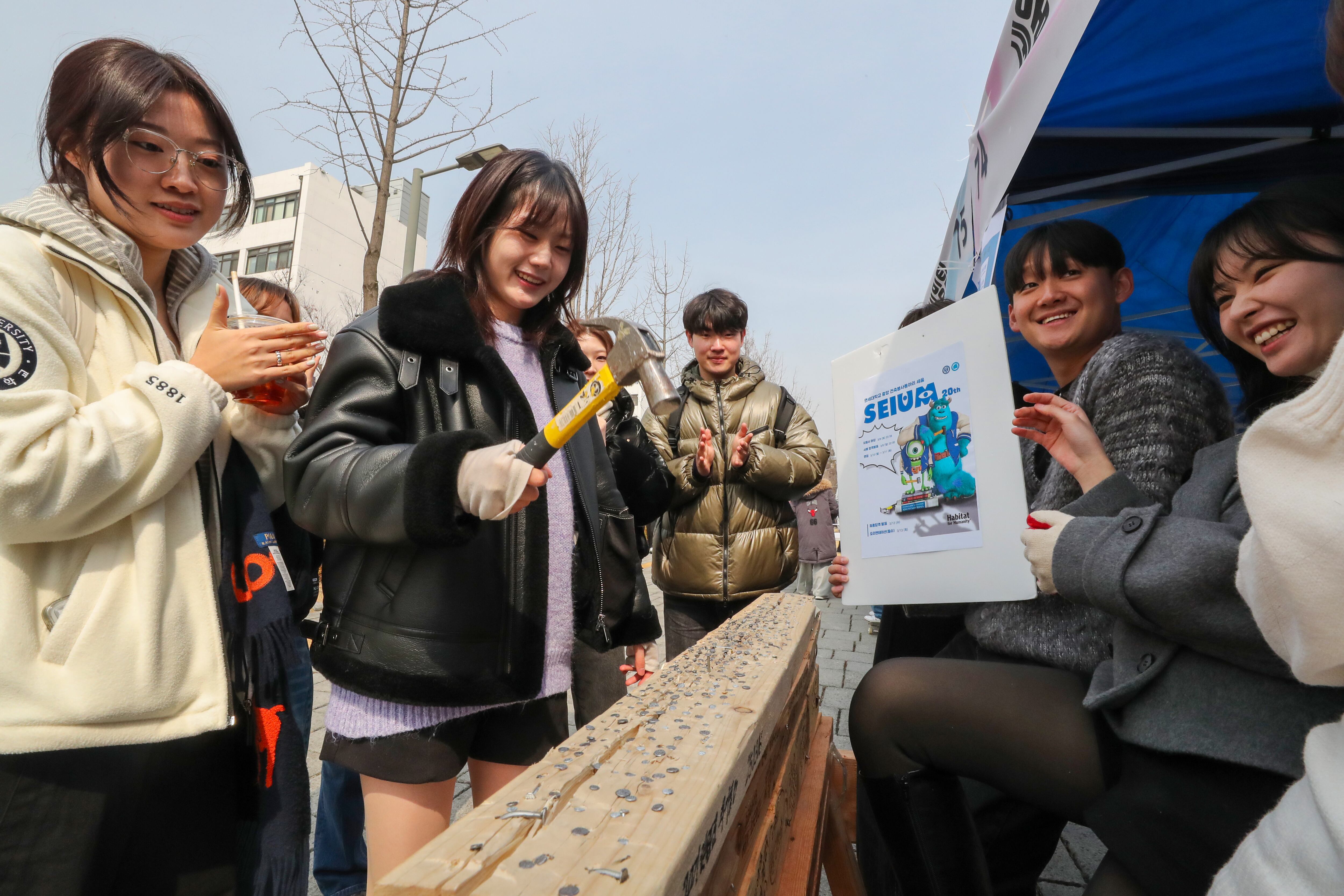 On the afternoon of the March 7, 2025 students are promoting their snowboarding club at a club fair held at Yonsei University in Seodaemun-gu, Seoul. (Photo by Park Seong-won)