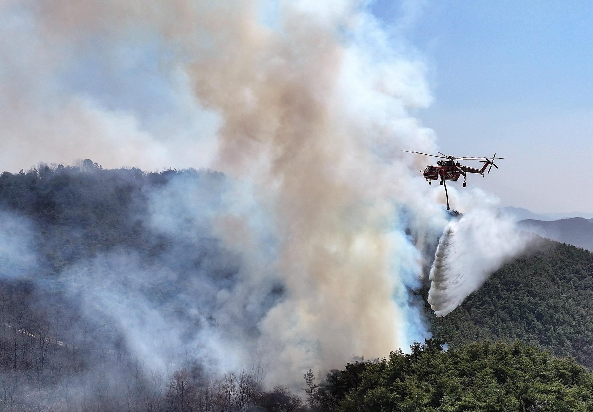 A Korea Forest Service helicopter is used to help extinguish a forest fire near its ignition point in Uiseong, Gyeongbuk, on March 23, 2025. (Photo by Yonhap/AFP Photo)