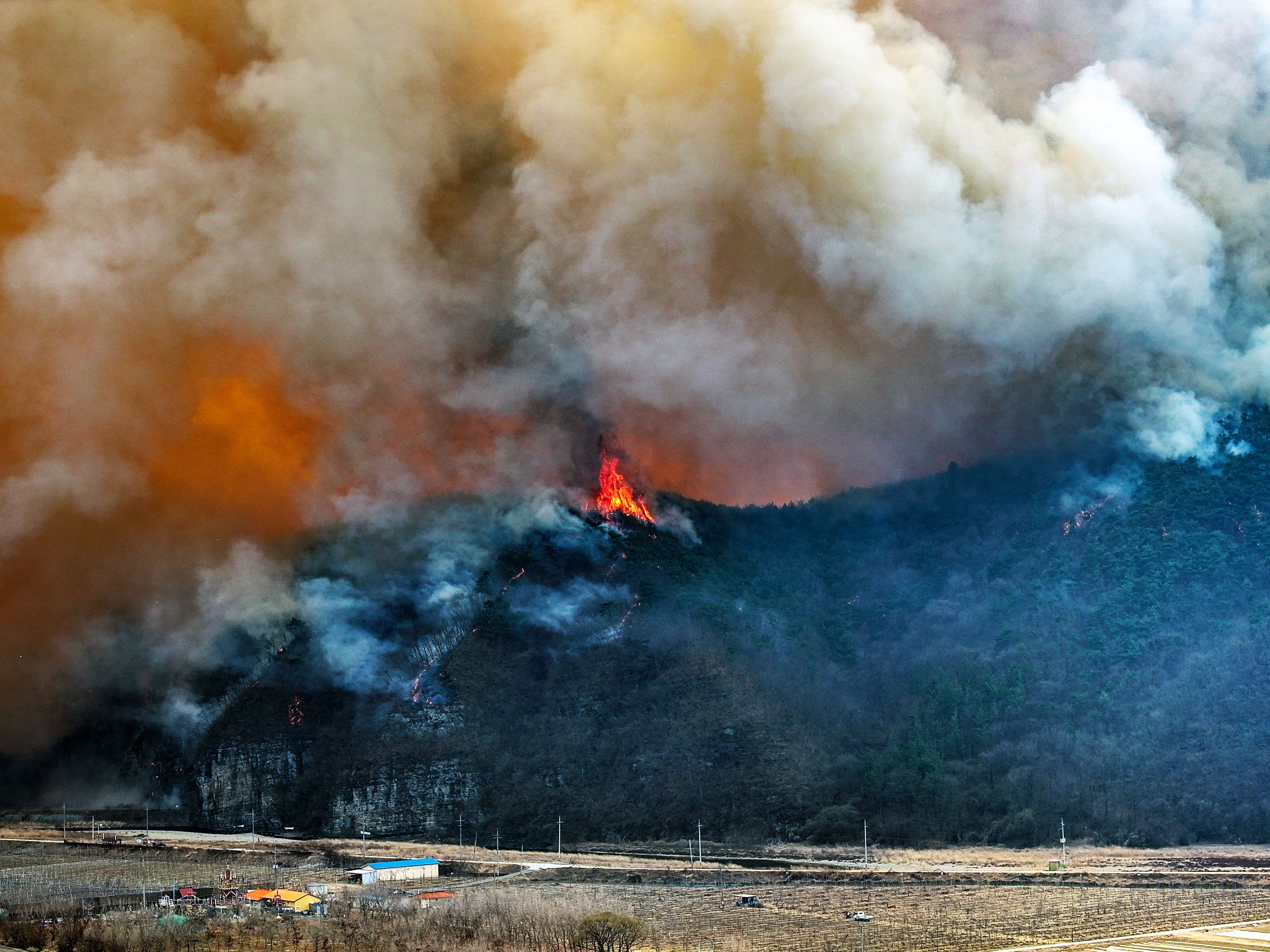 Flames and smoke rise above a mountain in Uiseong, North Gyeongsang Province, South Korea, 24 March 2025, as a wildfire fueled by strong winds spreads for the third consecutive day. (Photo by Yonhap/EPA/EFE)
