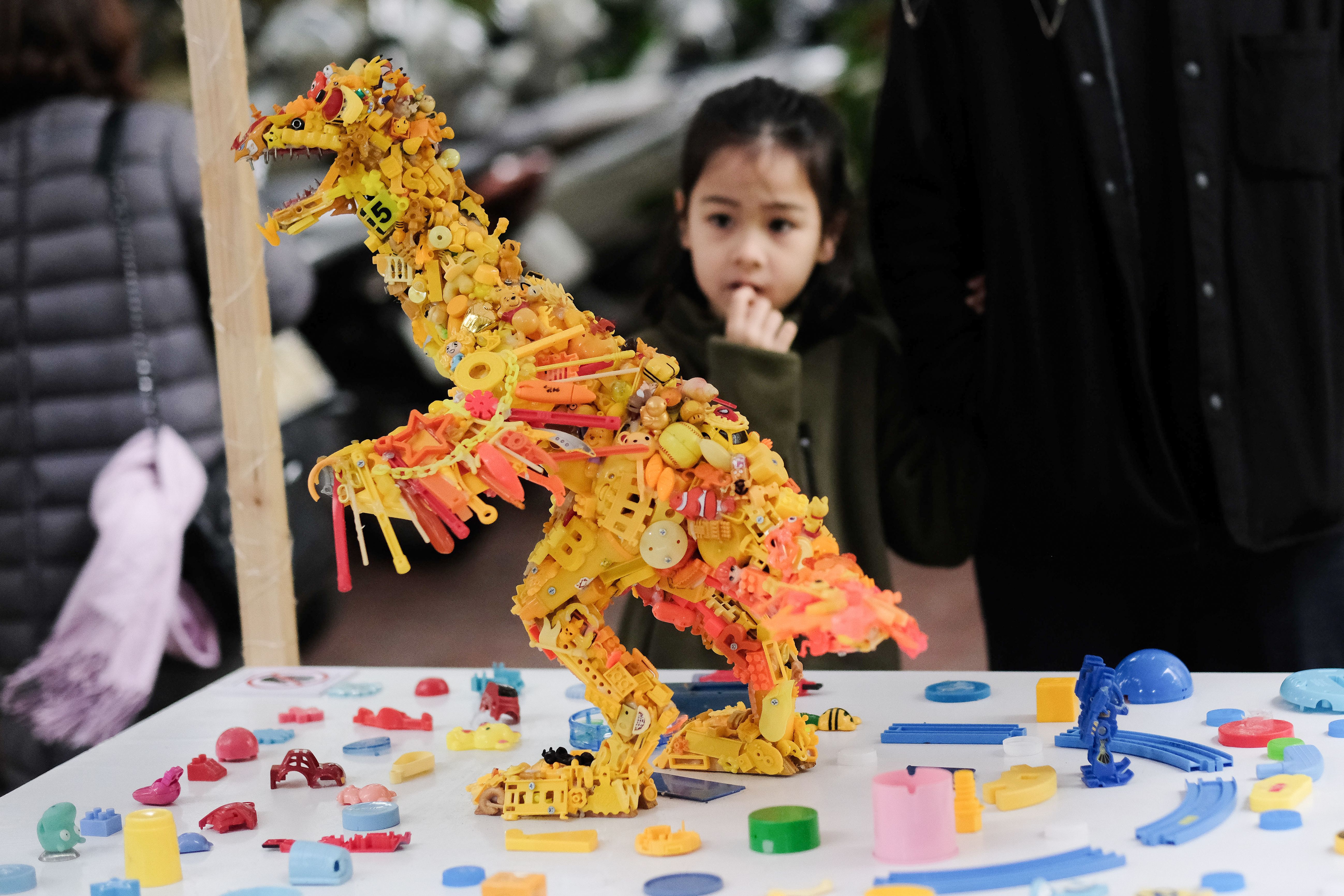 A visitor looks at an art installation during the “Plastic Dinoland” exhibition by Japanese artist Hiroshi Fuji, in Hanoi, Vietnam, 17 March 2025. The exhibition, which features colorful installations of dinosaurs made from discarded toys, runs from 15 March to 01 June 2025 at The Japan Foundation in Hanoi. (Photo by Luong Thai Linh/EPA/EFE)