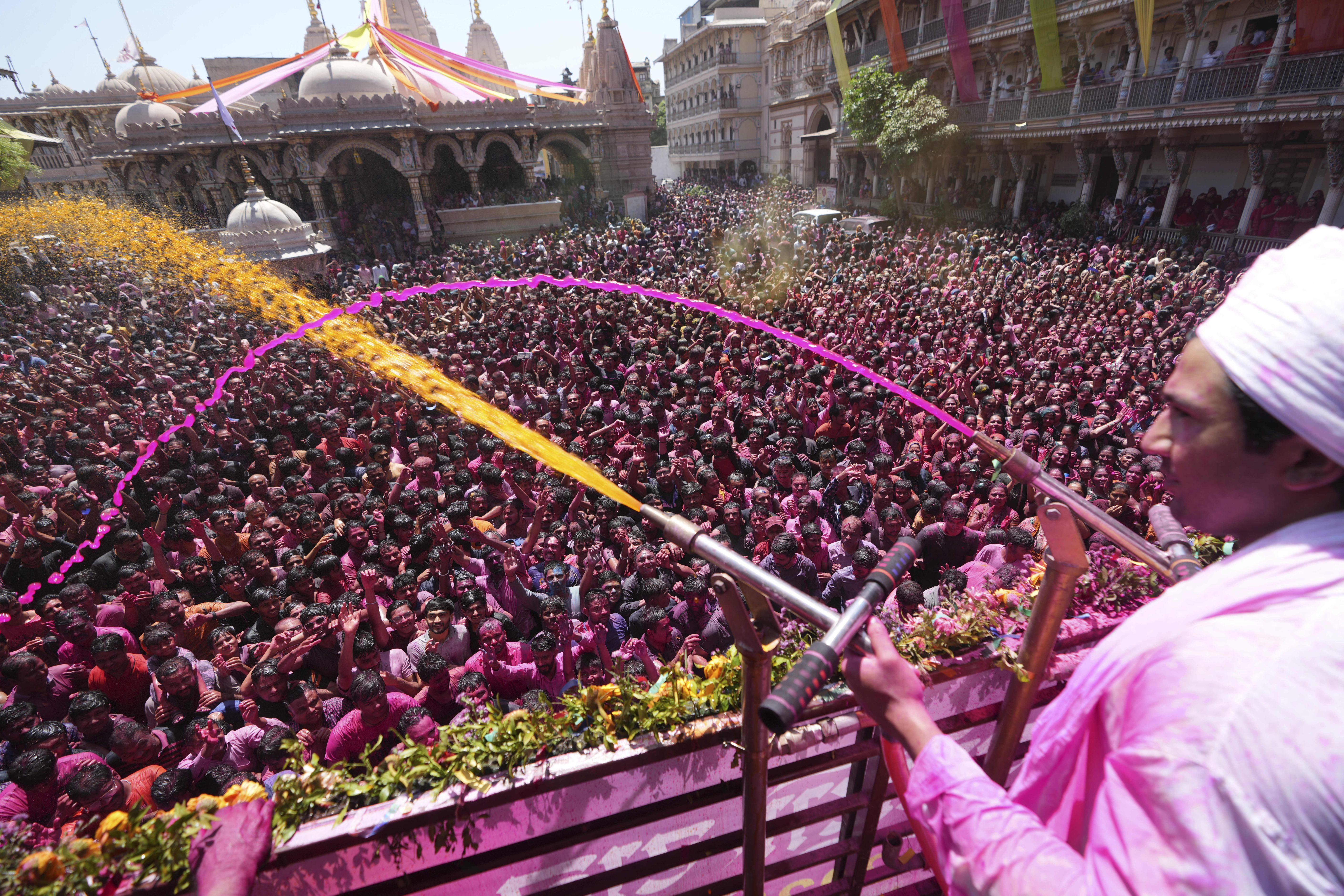 A priest sprays colored powder and water on devotees during celebrations of Holi, the Hindu festival of colors, at the Kalupur Swaminarayan temple in Ahmedabad, India, Friday, March 14, 2025. (Photo by Ajit Solanki/AP Photo)