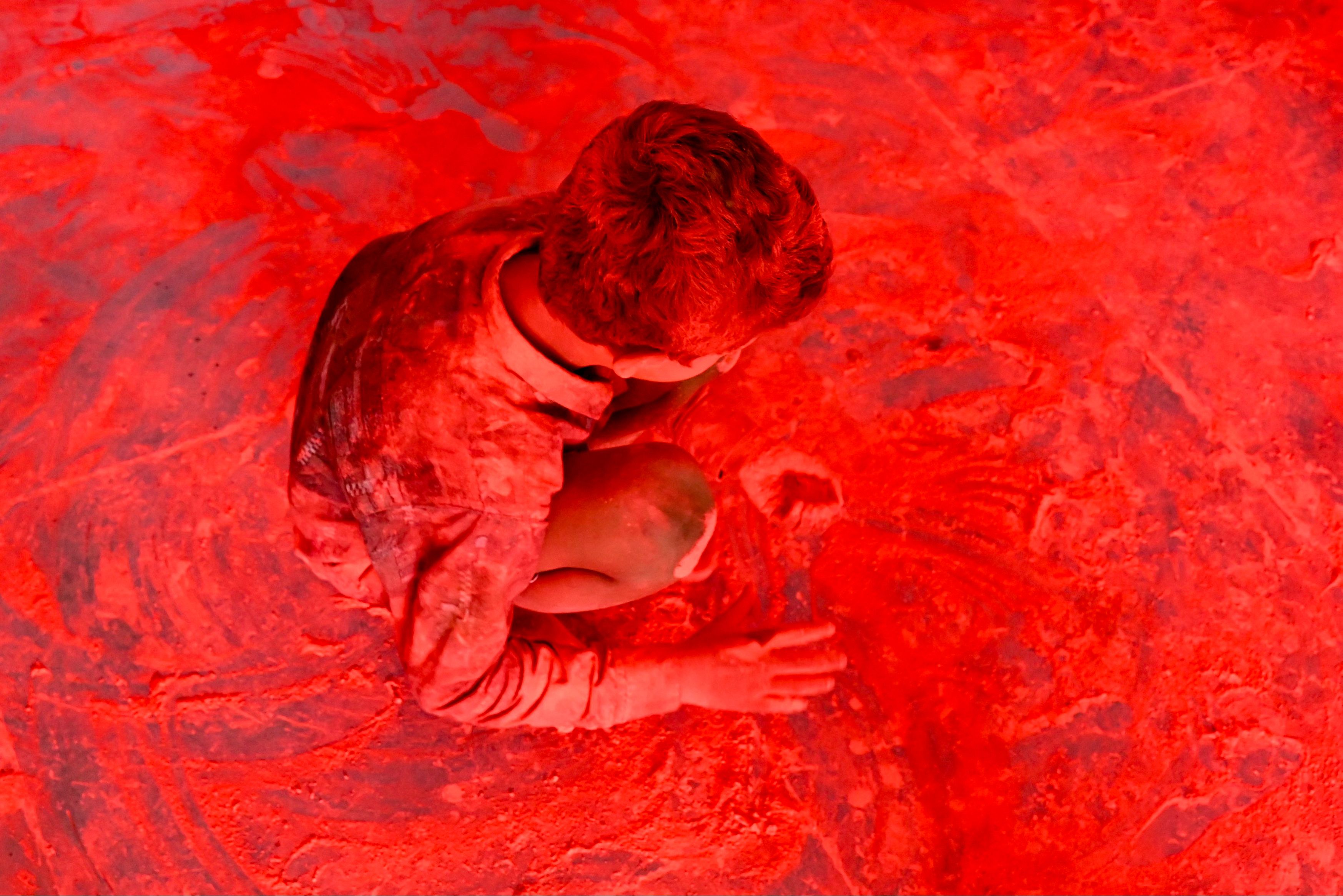 A visually impaired child celebrates Holi, the Hindu spring festival of colours, at a school for the blind in Hyderabad on March 14, 2025. (Photo by Noah Seelam/AFP Photo)