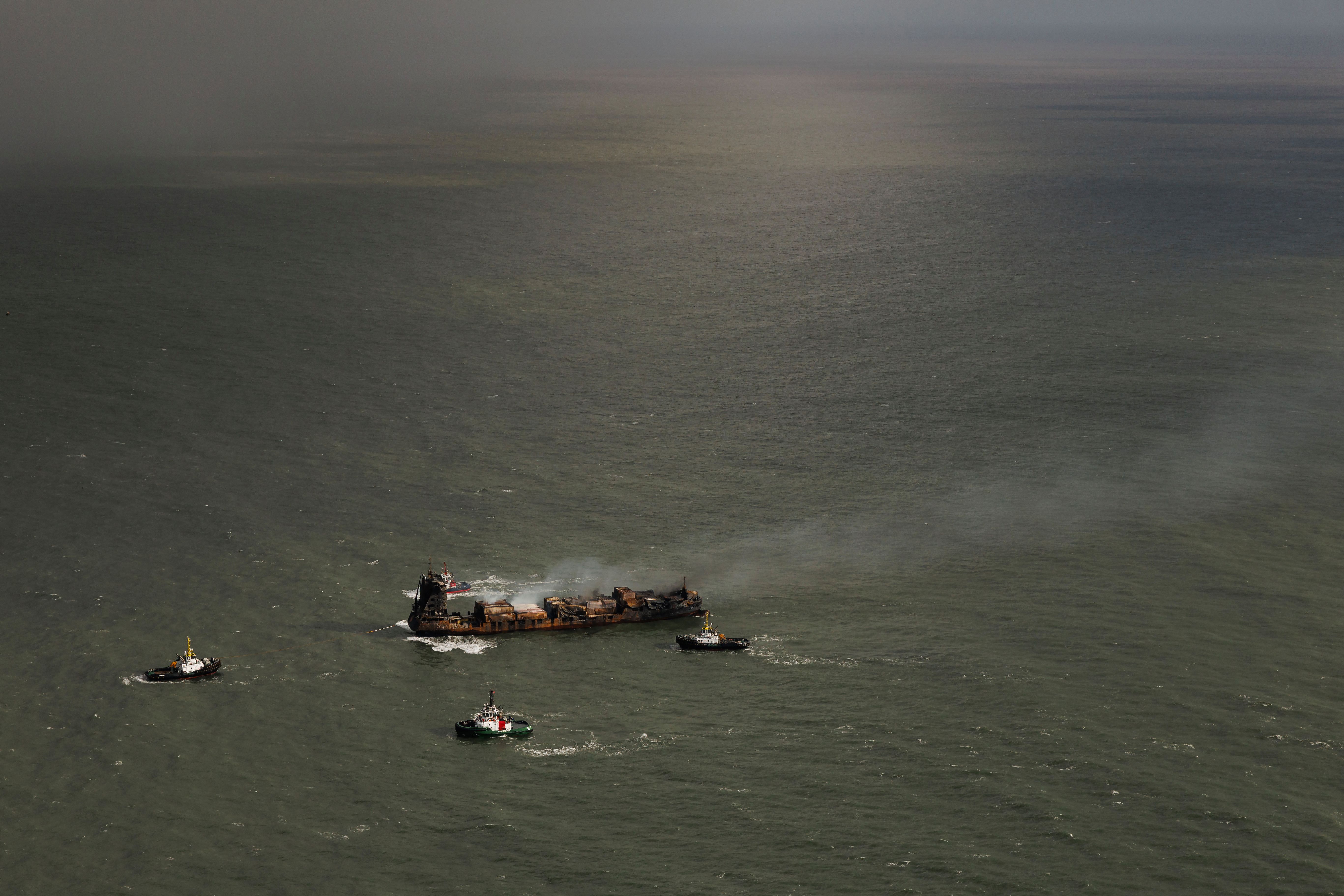 Smoke billows from the MV Solong cargo ship off the Yorkshire coast in the North Sea, Britain, 11 March 2025. Thirty-six people were reportedly brought ashore, and one taken to hospital, after the collision of the oil tanker Stena Immaculate and the Solong, a cargo vessel, off the East Yorkshire coast on 10 March 2025 morning. The coastguard has said a search has been called off for one missing crew member of the Solong. (Photo by Dan Kitwood/EPA/EFE)