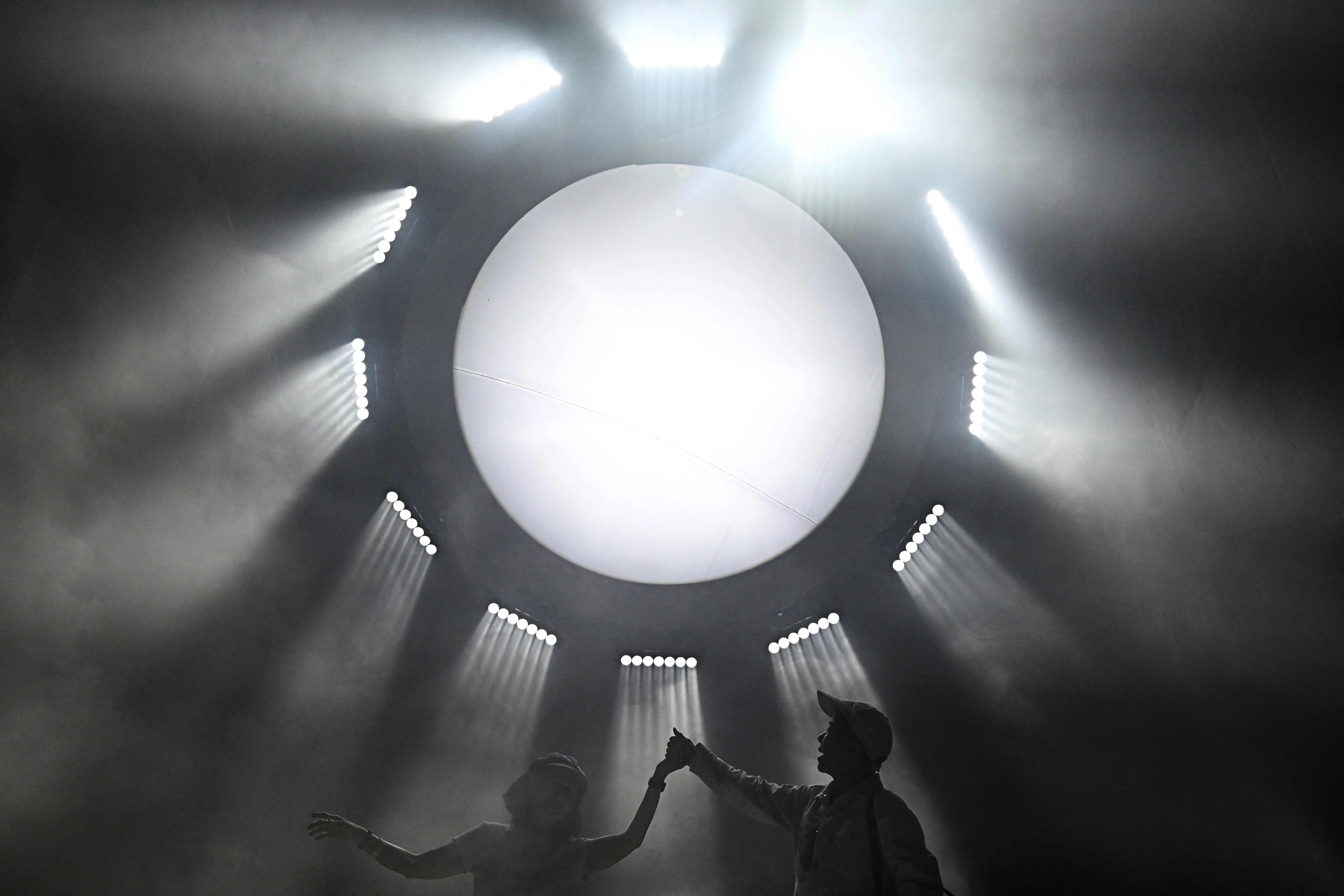 Visitors pose for pictures with light installations at SangSom Moonlab, an interactive art exhibition at One Bangkok on March 17, 2025. (Photo by Lillian Suwanrumpha/AFP Photo)