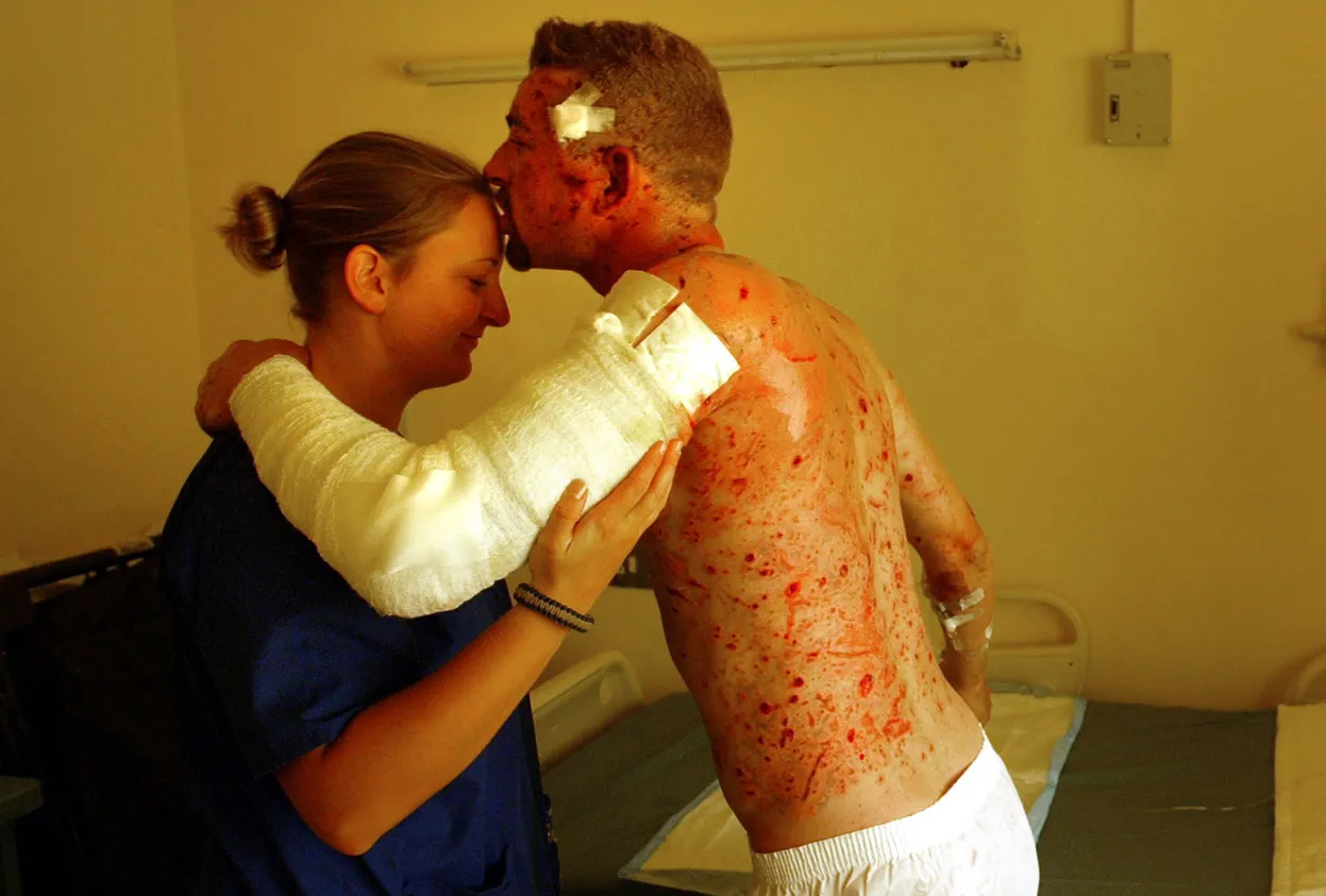 British private contractor Michael Fitzpatrick thanks his U.S. Army nurse Jayme Sells while recovering from a suicide bomb attack in an American military hospital in Baghdad, on October 15, 2004. Fitzpatrick said that he was drinking coffee in the Green Zone Cafe Thursday when a suicide bomber detonated in one of two explosions that killed 6 people and wounded many more. (Photo by John Moore/AP Photo via The Atlantic)
