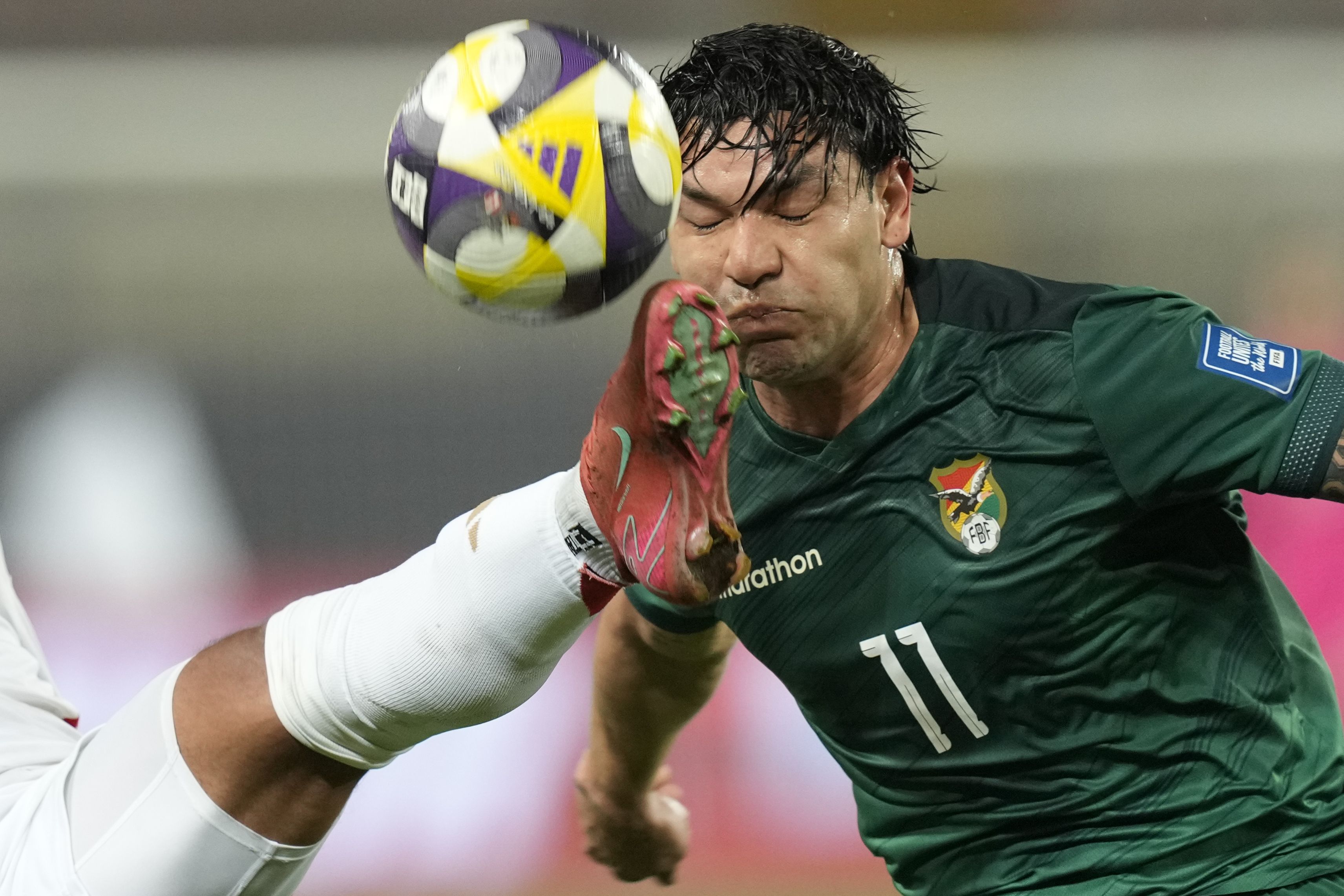 Bolivia's Carmelo Algaranaz attempts to head the ball as Peru's Miguel Trauco kicks it during a World Cup 2026 qualifying soccer match in Lima, Peru, March 20, 2025. (Photo by Martin Mejia/AP Photo)