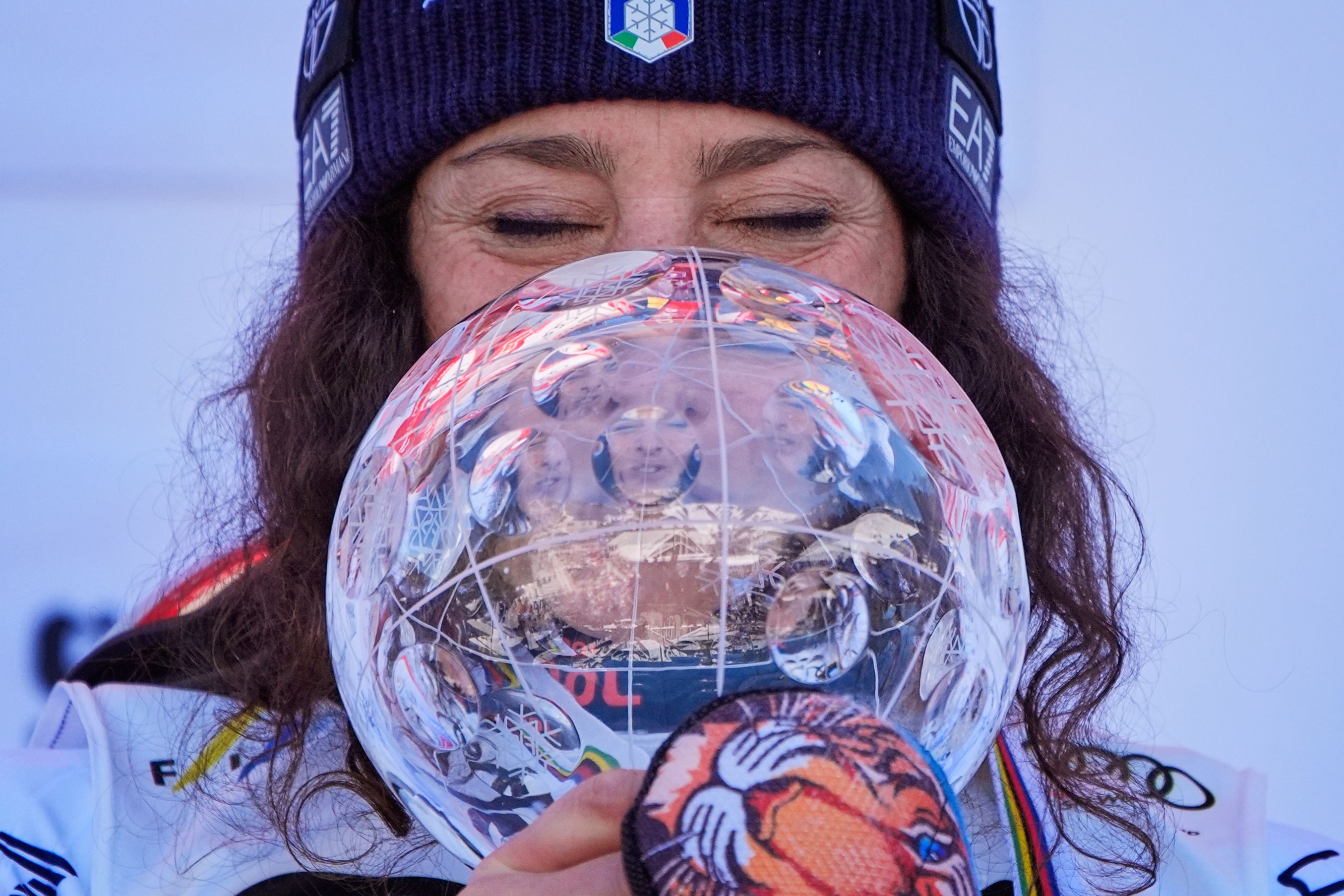 Italy's Federica Brignone is reflected in the crystal globe trophy after winning the women's giant slalom season championship at the World Cup Finals, Tuesday, March 25, 2025, in Sun Valley, Idaho. (Photo by John Locher/AP Photo)