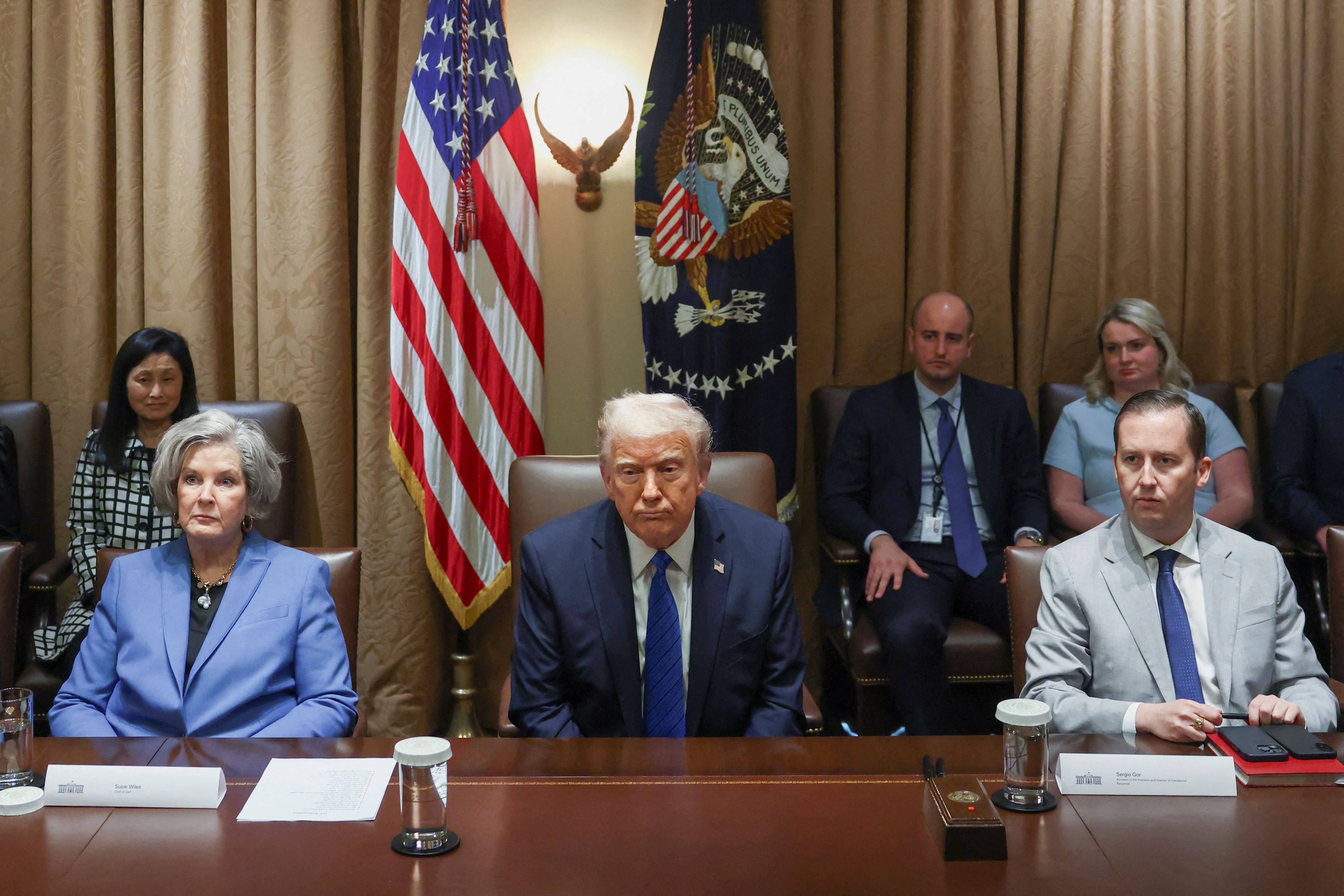 U.S. President Donald Trump reacts as Director Presidential Personnel Office Sergio Gor and White House Chief of Staff Susie Wiles sit next to him on the day of a meeting with U.S. ambassadors at the White House in Washington on March 25, 2025. (Photo by Evelyn Hockstein/Reuters)